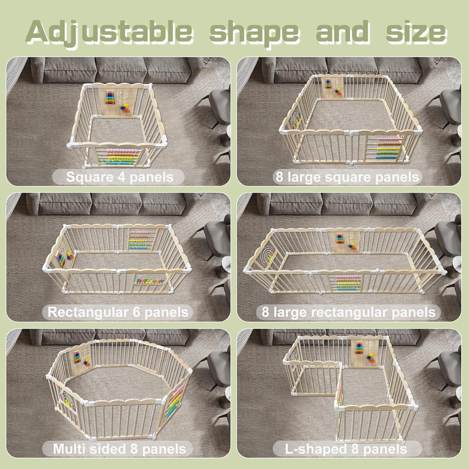 Baby Playpen – 60 x 60 x 24 in Adjustable Multi-Shape Wood Play Yard, Foldable Wooden Baby Playpen/Fence Play Area and Activity Center for Babies and Toddlers with Child Proof Lock and Gate