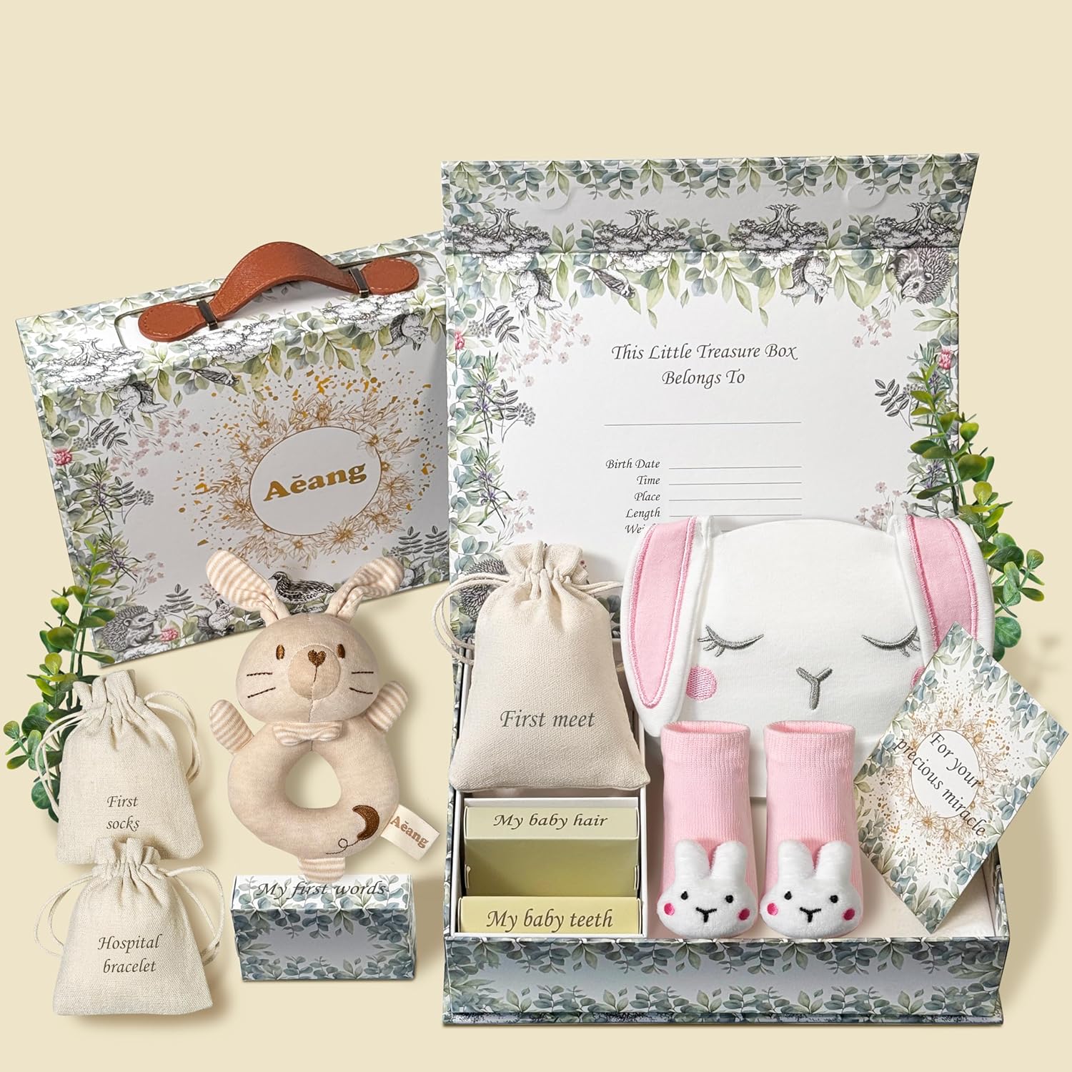 Baby Shower Gifts for Mom, Newborn Baby Gift Set for Baby Girl Baby Boy – Keepsake Box with Baby Hat, Rattle Socks, Sensory Development Rattle (Bunny)