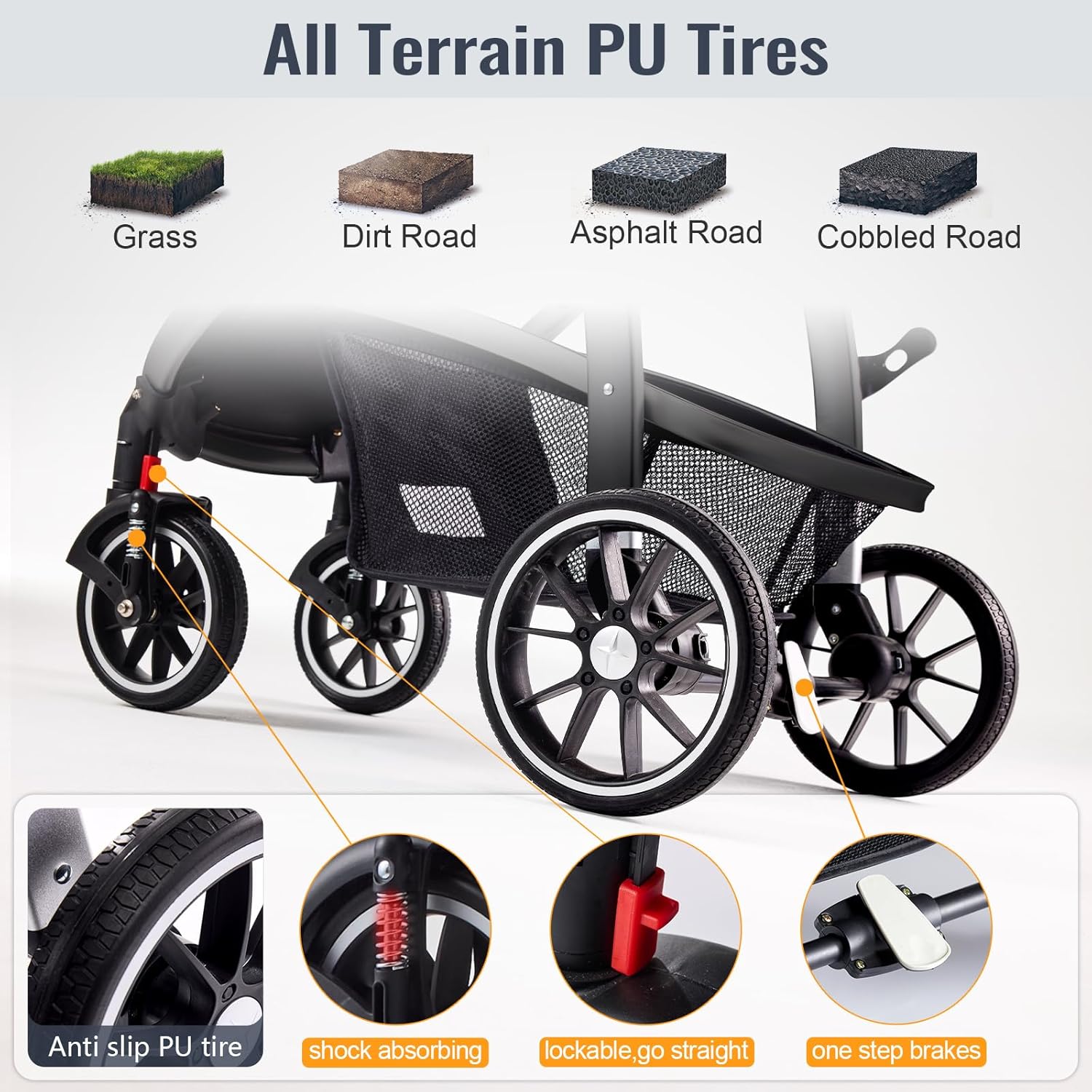 SAFETY DESIGN: The newborn stroller is equipped with 5-point harnesses to keep the baby secure. The pram stroller also features a one-foot brake, shock absorbers, and a sun canopy to enhance safety in different conditions.