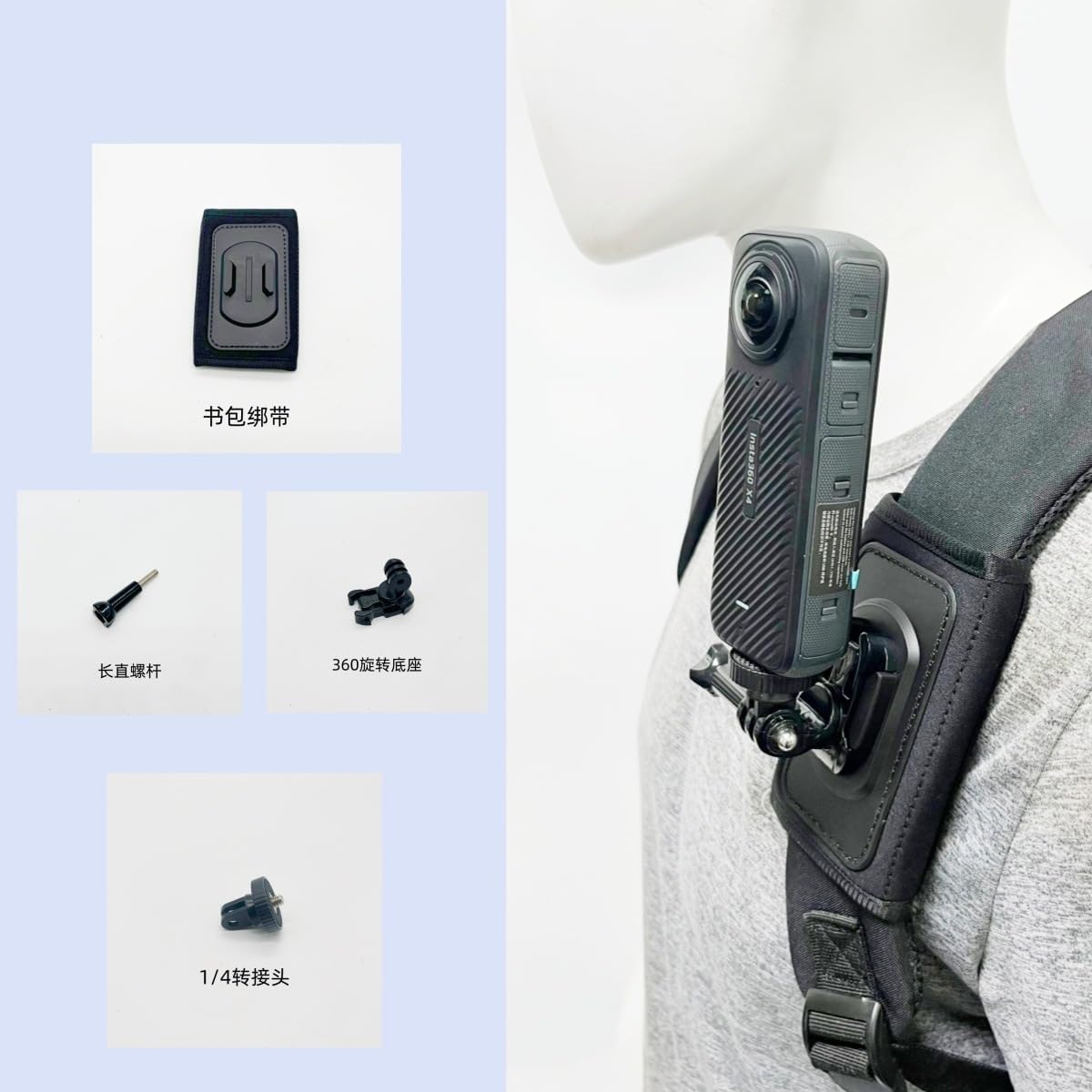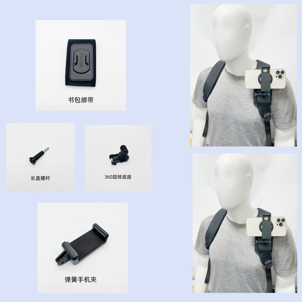 Backpack Shoulder Strap Velcro Clip Pad Mount with 360 Degree Rotating Base and Phone Clip for Go pro Hero 13/12/11/10/9/8 Insta 360 One Action Cameras and Smartphone