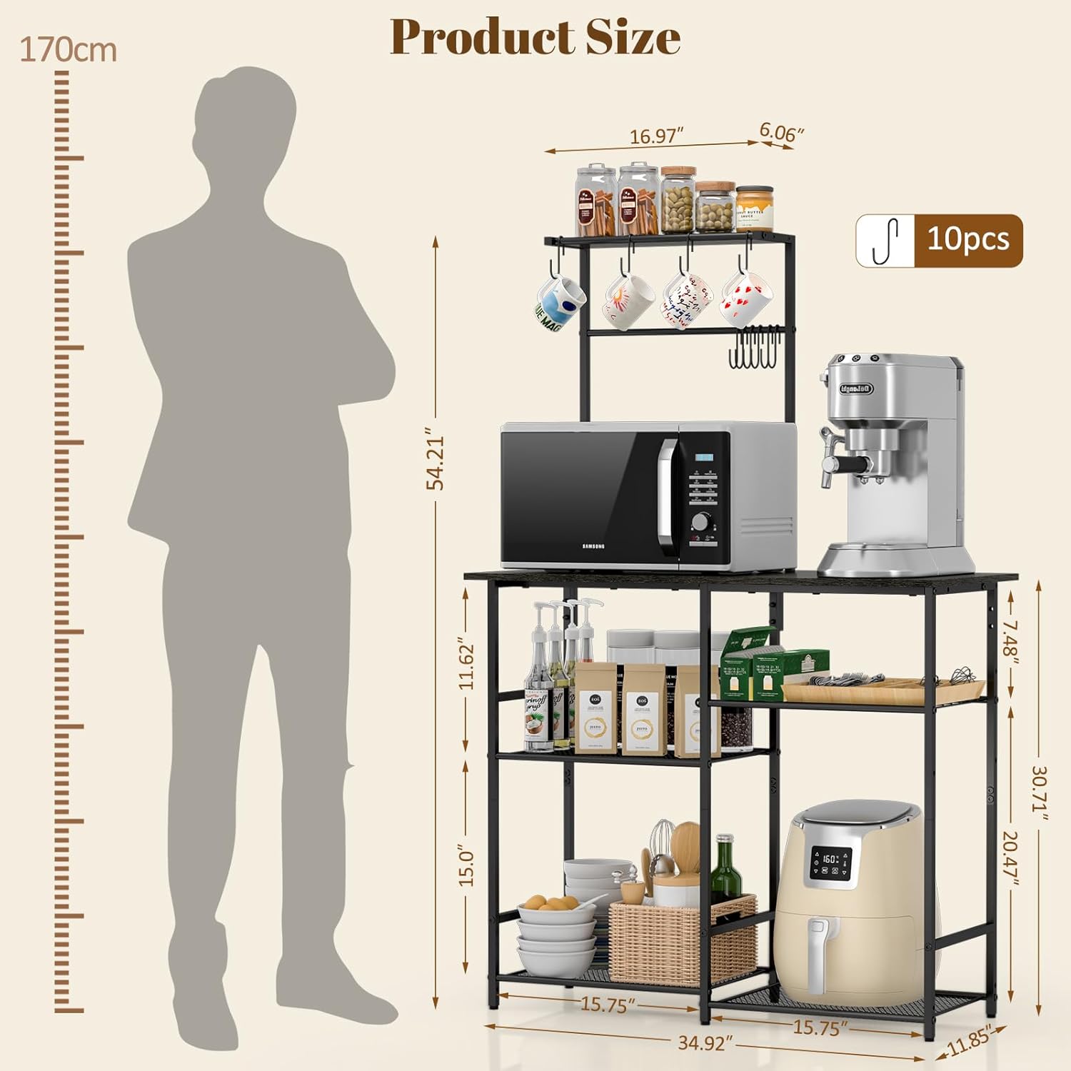 [Multifunctional Kitchen Storage Rack]: The 6-layer baker’s rack has 1 large countertop, 4 bottom partitions, 10 s-shaped hooks, and 1 top shelf, providing you with plenty of space to place the coffee maker, microwave oven, bread machine, pots and pans, spices and other supplies. It meets the diversified needs of kitchen shelves.