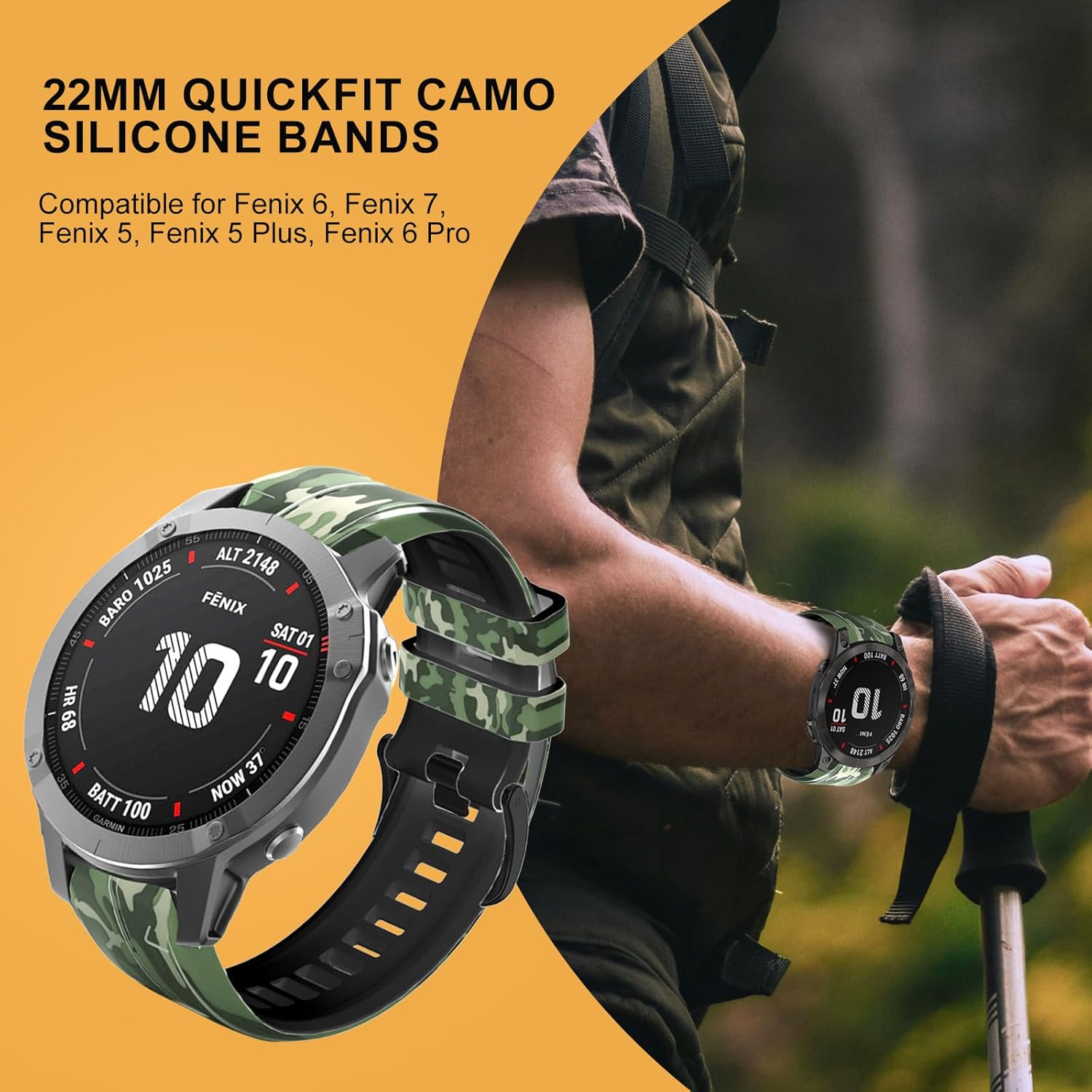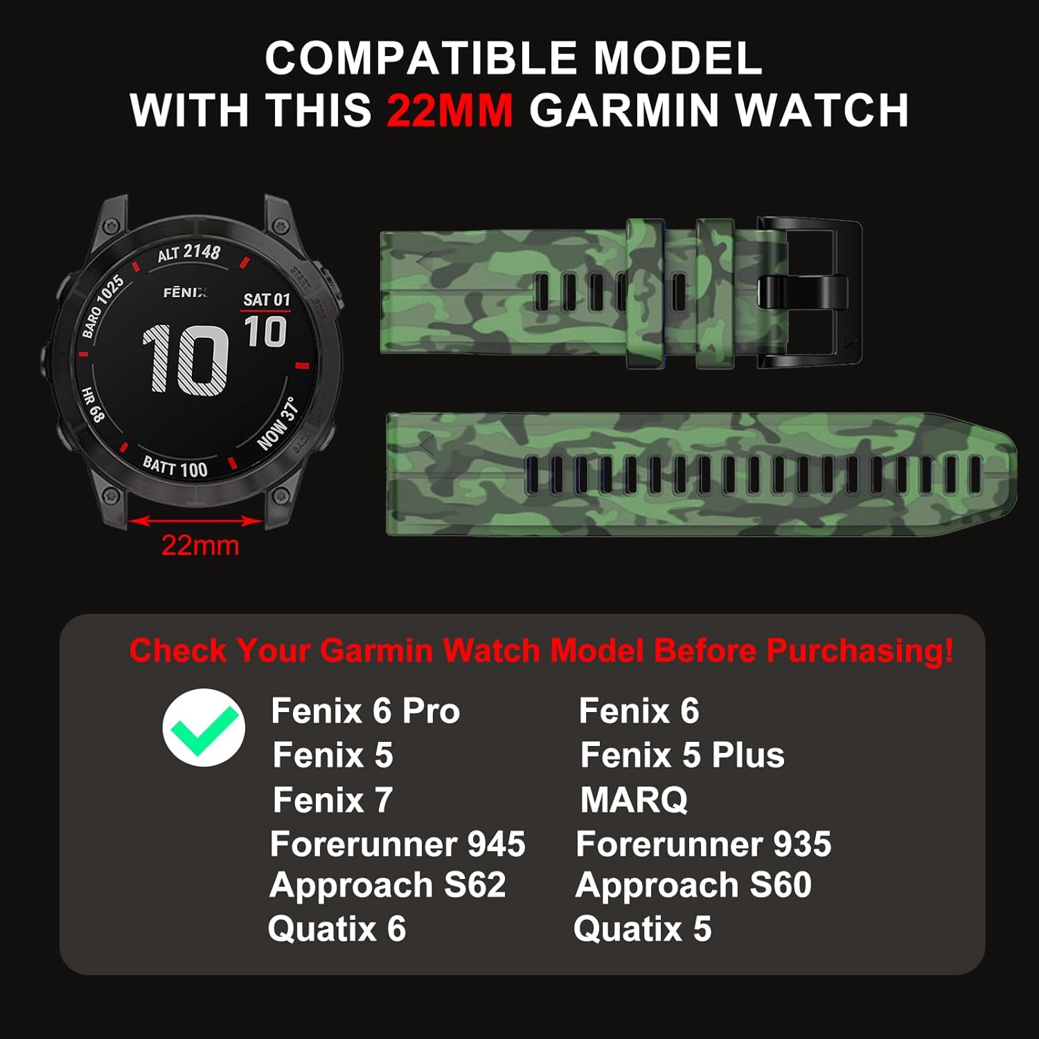 Bandkids 22mm Camo Band for Garmin Fenix 5/6/7,Fenix 6 Pro,Fenix 5 Plus Watch, Quickfit Adjustable Waterproof Sport Silicone Bands for Garmin Approach S62/S60,Quatix 6/5,Forerunner 935/945
