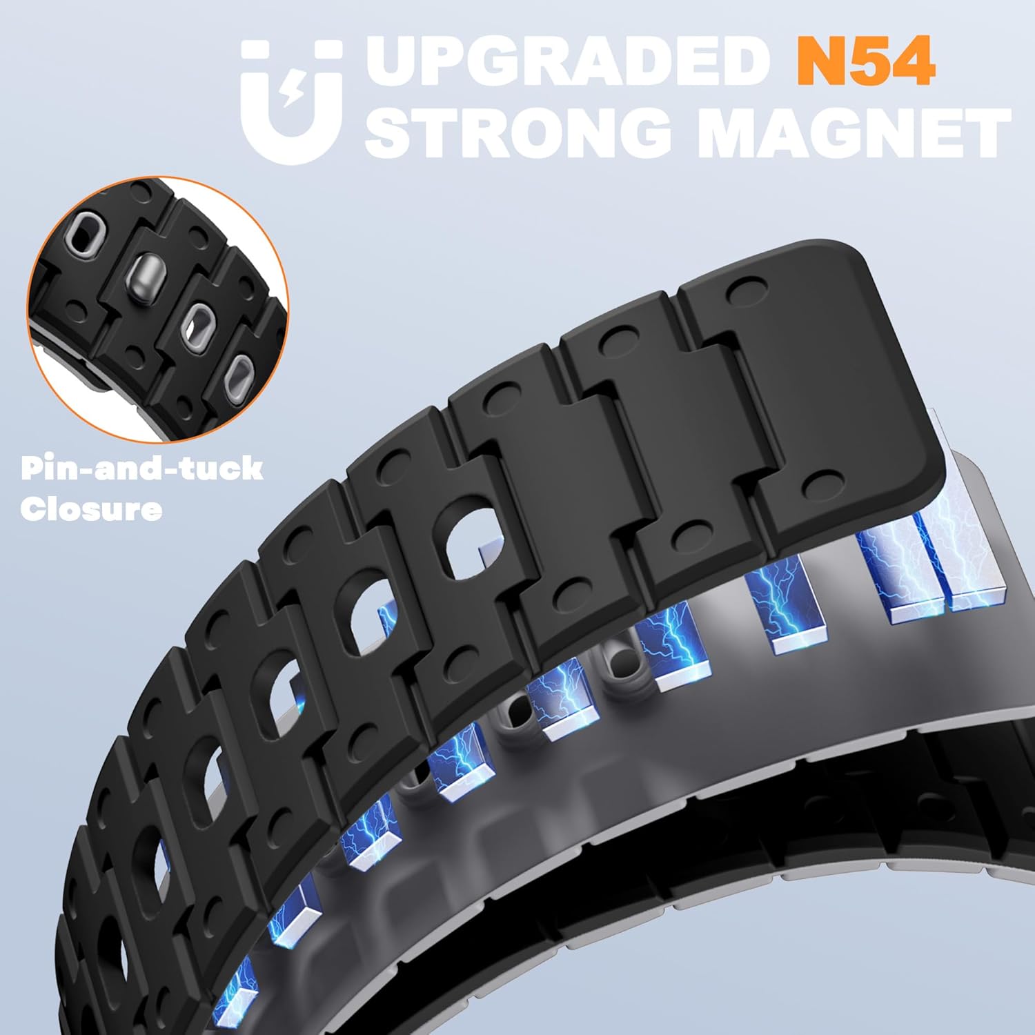 N52 Upgrade to N54 magnets: Bandletic silicone straps, previously featuring N52 magnets, have been upgraded to N54 magnets for improved performance. N54 magnets are 50-60% stronger than N52. Our watch bands now guarantee a secure fit during high-intensity activities such as marathons, weightlifting, and extreme sports. like marathons, weightlifting. The N54 magnets maintain their strength much longer, ensuring a consistently secure fit throughout the band’s lifespan