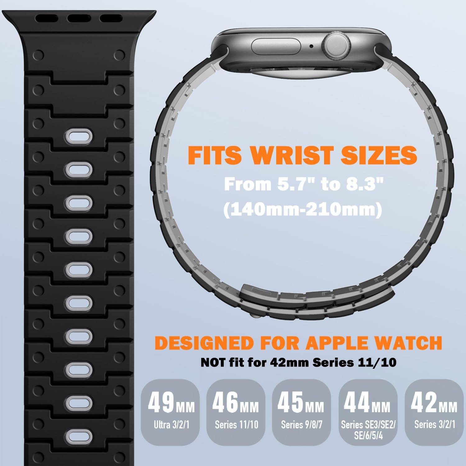 Compatible Models: Bandletic Ultra 2 watch band compatible with Apple Watch band 49mm/46mm/45mm/44mm/42mm(Series 3/2/1), Bandletic magnetic watchband ultra watch straps outdoor waterproof sport bands are compatible with iWatch Ultra 3, SE3, SE2, SE, Series 11/10/9/8/7/6/5/4 (Note: Watch Not Included). The magnetic smart watch bands is suitable for almost all wrists measuring 5.7″-8.3″(145mm-210mm). Tips: Please check the size on the back of your watch to choose correct size as you need