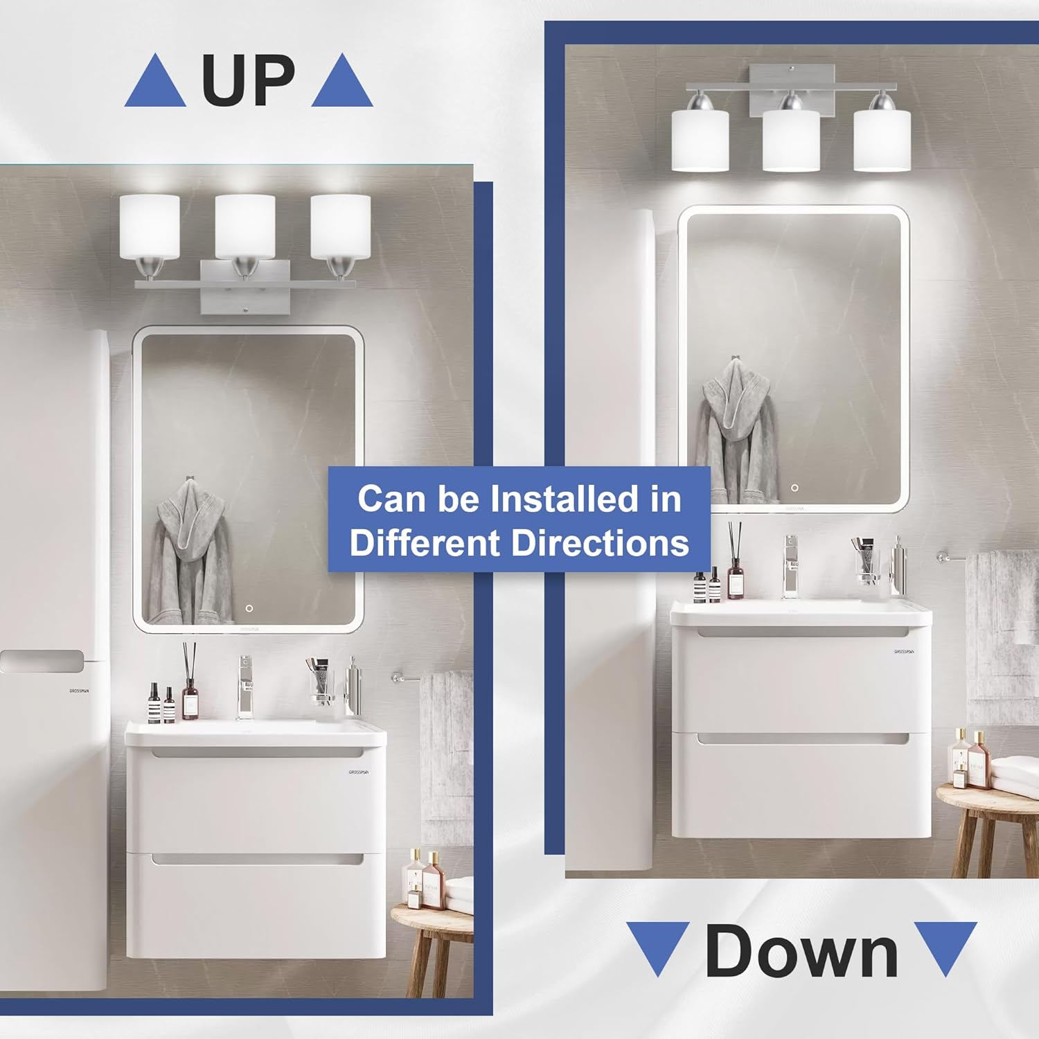 What makes these 3-light bathroom lighting different from others is that they are certified by FC, CE, and ROHS to meet U.S. recognized product safety standards. Safe enough to be used in the damp room like bathroom or bedroom.