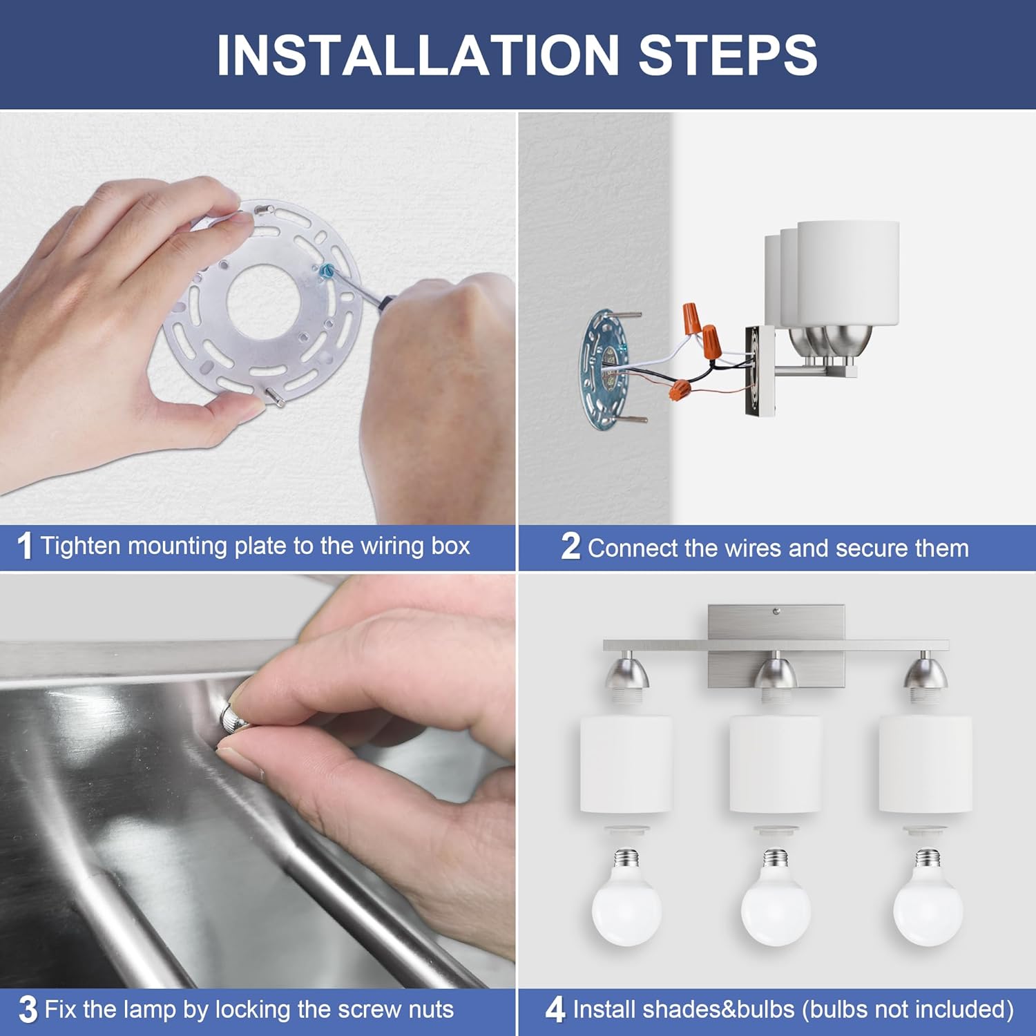 These bathroom vanity lights are compatible with E26 standard base bulbs (MAX 60W, bulbs not included). Any bulbs with E26 base and less than 60w are recommended. Choose the color temperature you love the most to decor your room. (NOT recommended: Bulbs with clear glass lampshade like edison bulbs)