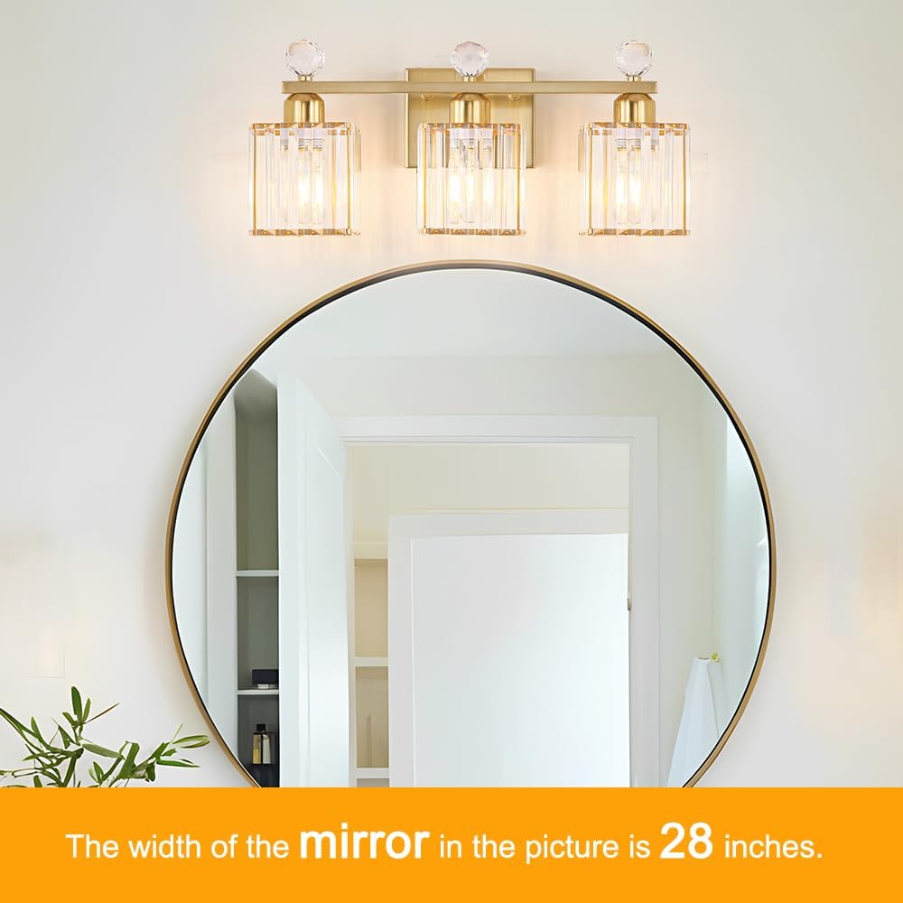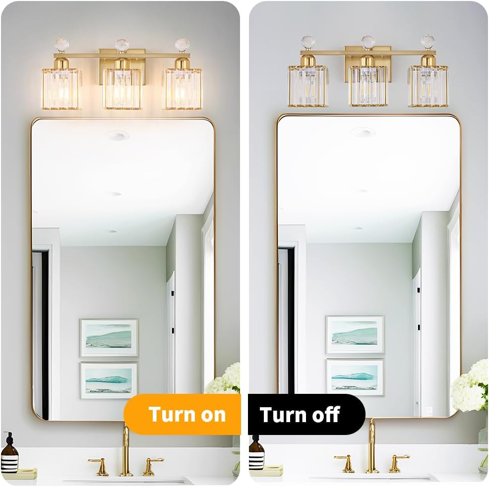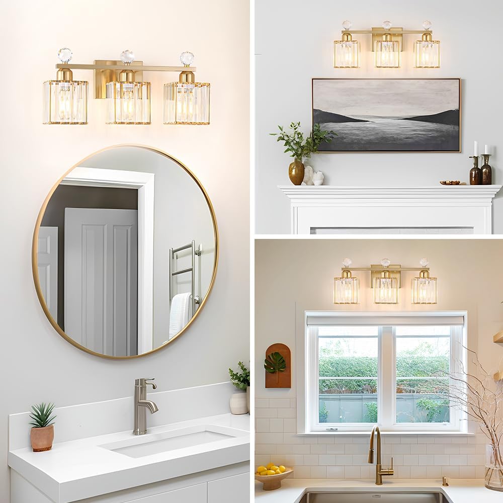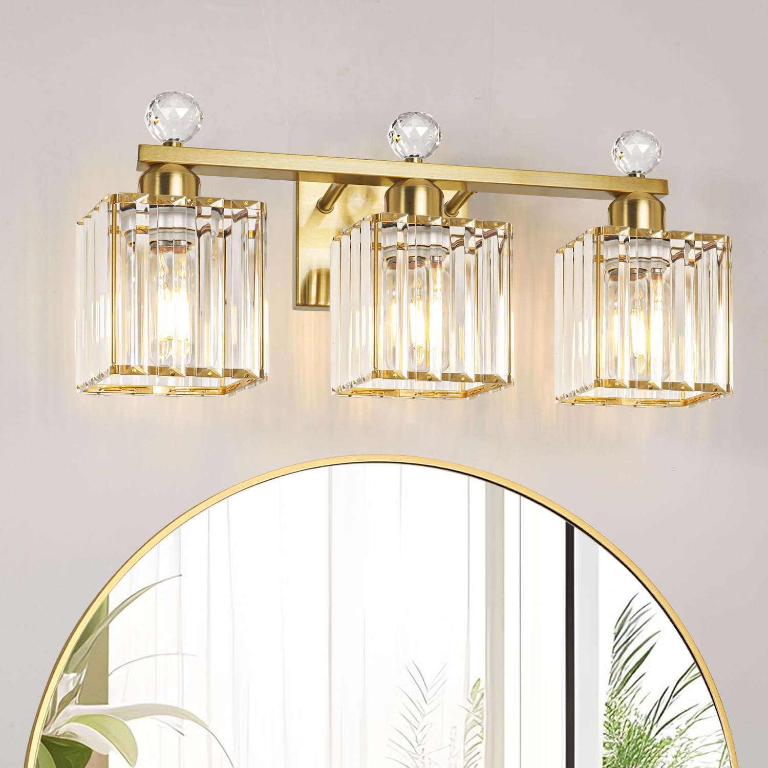 Bathroom Vanity Light Fixture 3-Light – Vanity Lights for Bathroom with Crystal Shade Gold Metal, Easy Install No Drilling Needed, Shadow-Free Illumination for Modern Bathroom Mirror Decor