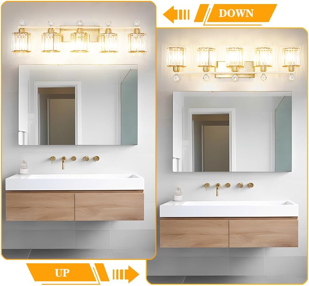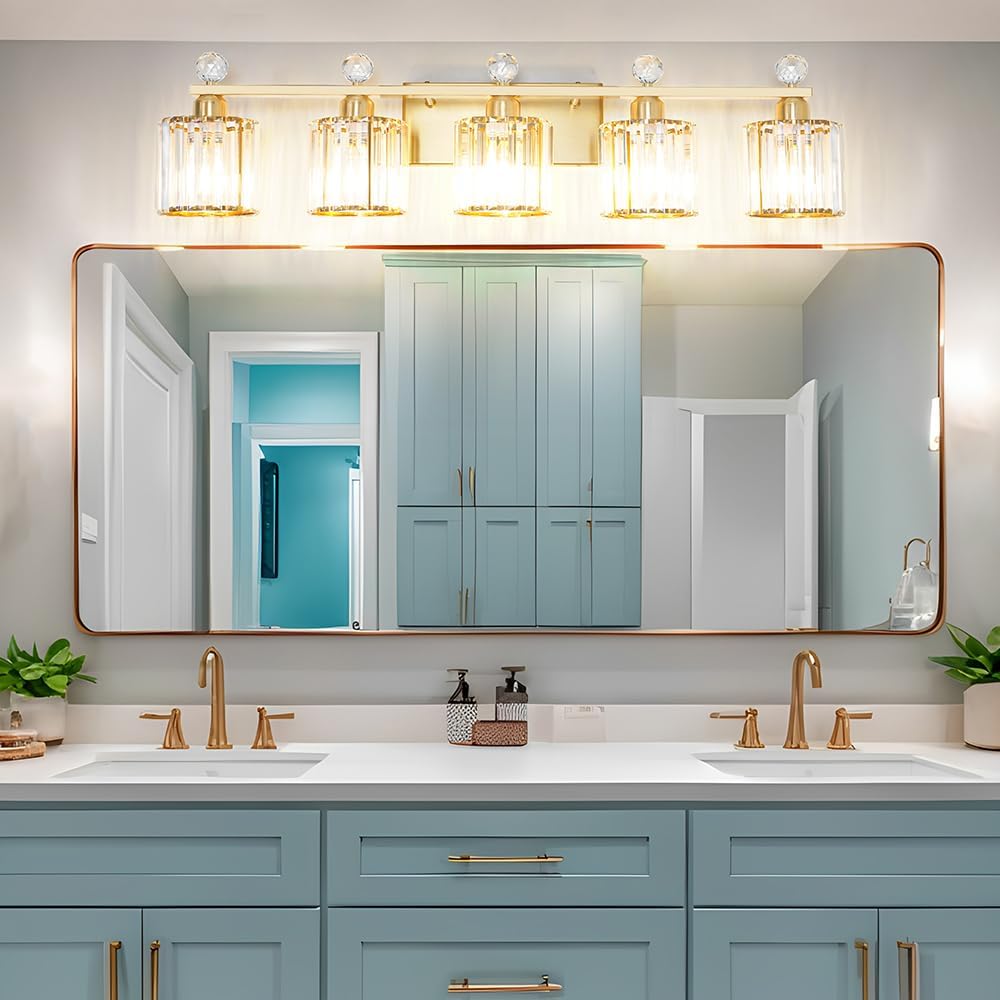 Bathroom Vanity Light Fixtures 5-lights, Gold Crystal Vanity Lights for Bath, Bathroom Lights Fixture with Clear Crystal Glass Shade, Modern Wall Light over Mirror, Wall Sconces Light for Hallway