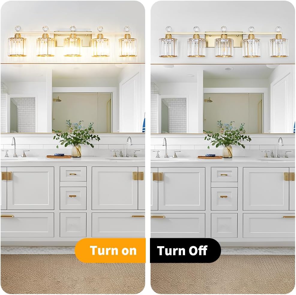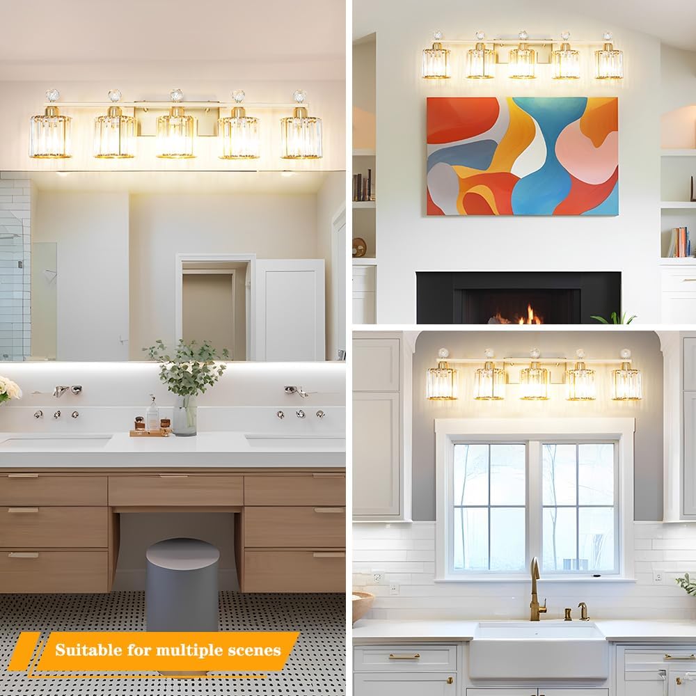 【Upgraded Brass Finish & Modern Classic Design】 Gold 5-light bathroom light fixtures feature a sleek brass gold finish lamp body accompanied by clear crystal glass shades. Clear glass dome shades soften the classic mid-century aesthetic