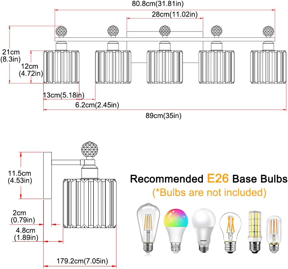 【Bathroom Light Source】 E26 US standard socket. maximum power 60W and compatible with any E26 base LED bulbs, CFL bulbs, Edison bulbs and dimmable when used with dimmable bulbs and compatible dimmer switches. (Note: bulbs are not included