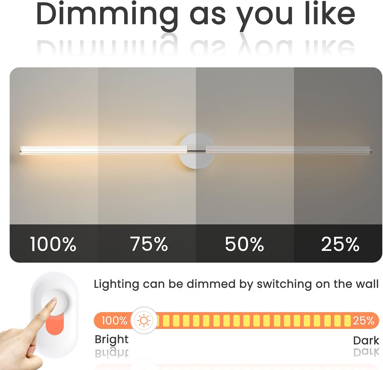 LED Dimmable Brightness: built-in LED vanity light bar ensures energy efficiency. With a dimmer switch (not provided) brightness can be adjusted from 5% to 100%, offering a wide range of lighting. PMMA acrylic material for high light transmission