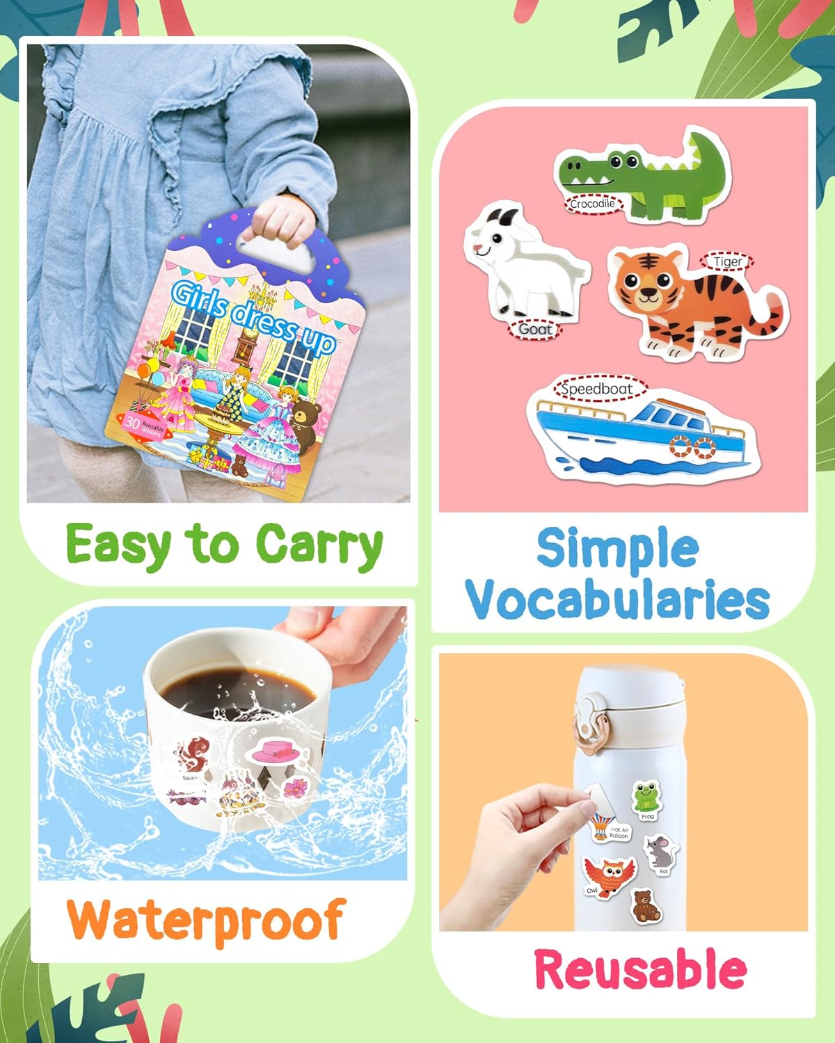Reusable Stickers for Kids: Sticker book is made with waterproof, reusable PVC material and contains 3 themes – Animal + Princess + Traffic.