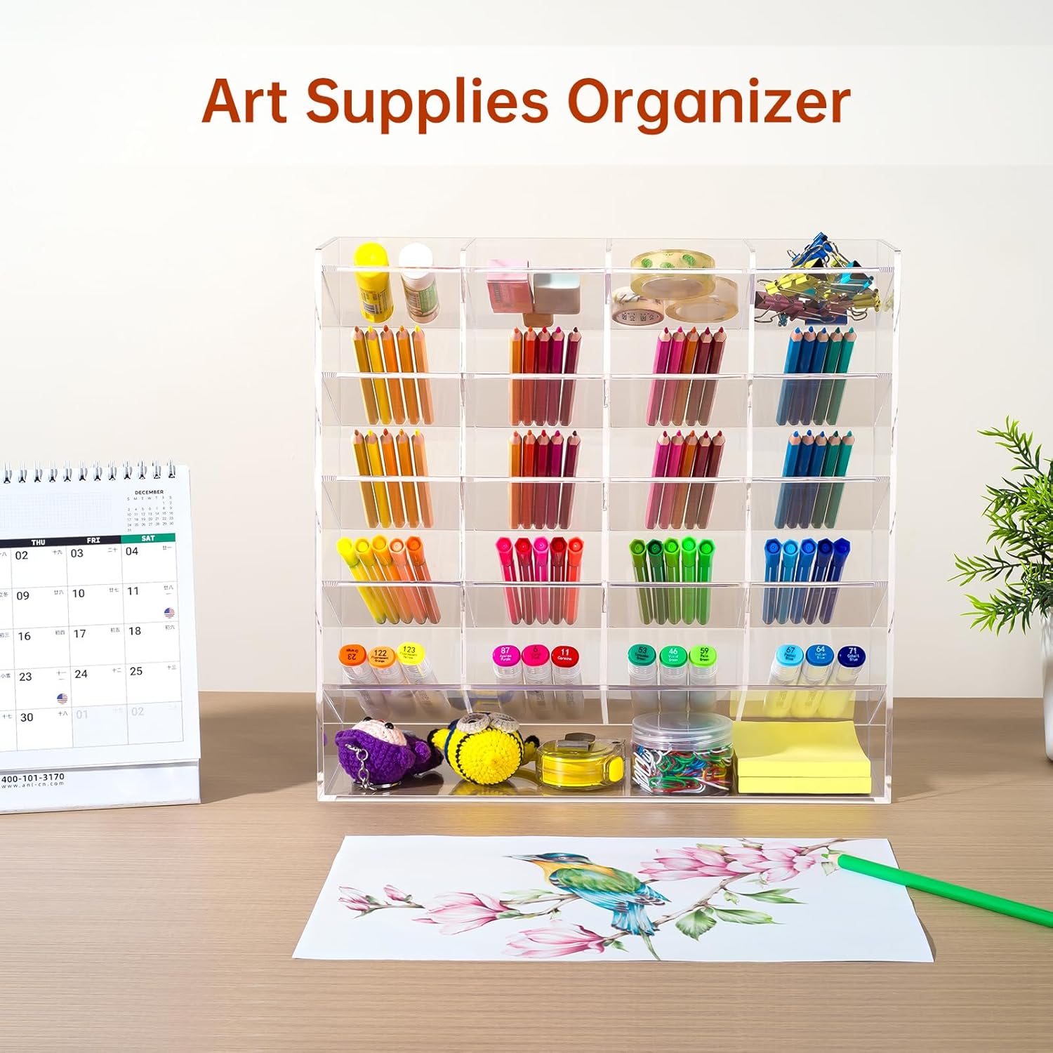 【SORTED & ACCESSIBLE】– Designed with 21 compartments and an inclined structure, this pen holder makes it easy to sort items by color or type for quick access. The clear acrylic allows instant visibility, making retrieval and return effortless while keeping your workspace clutter-free.