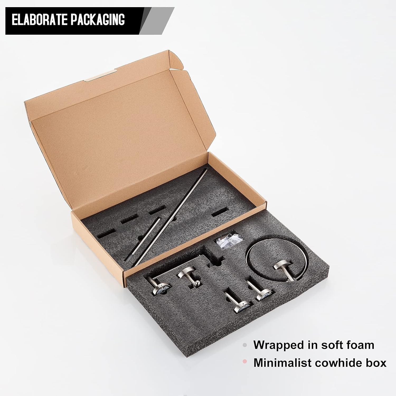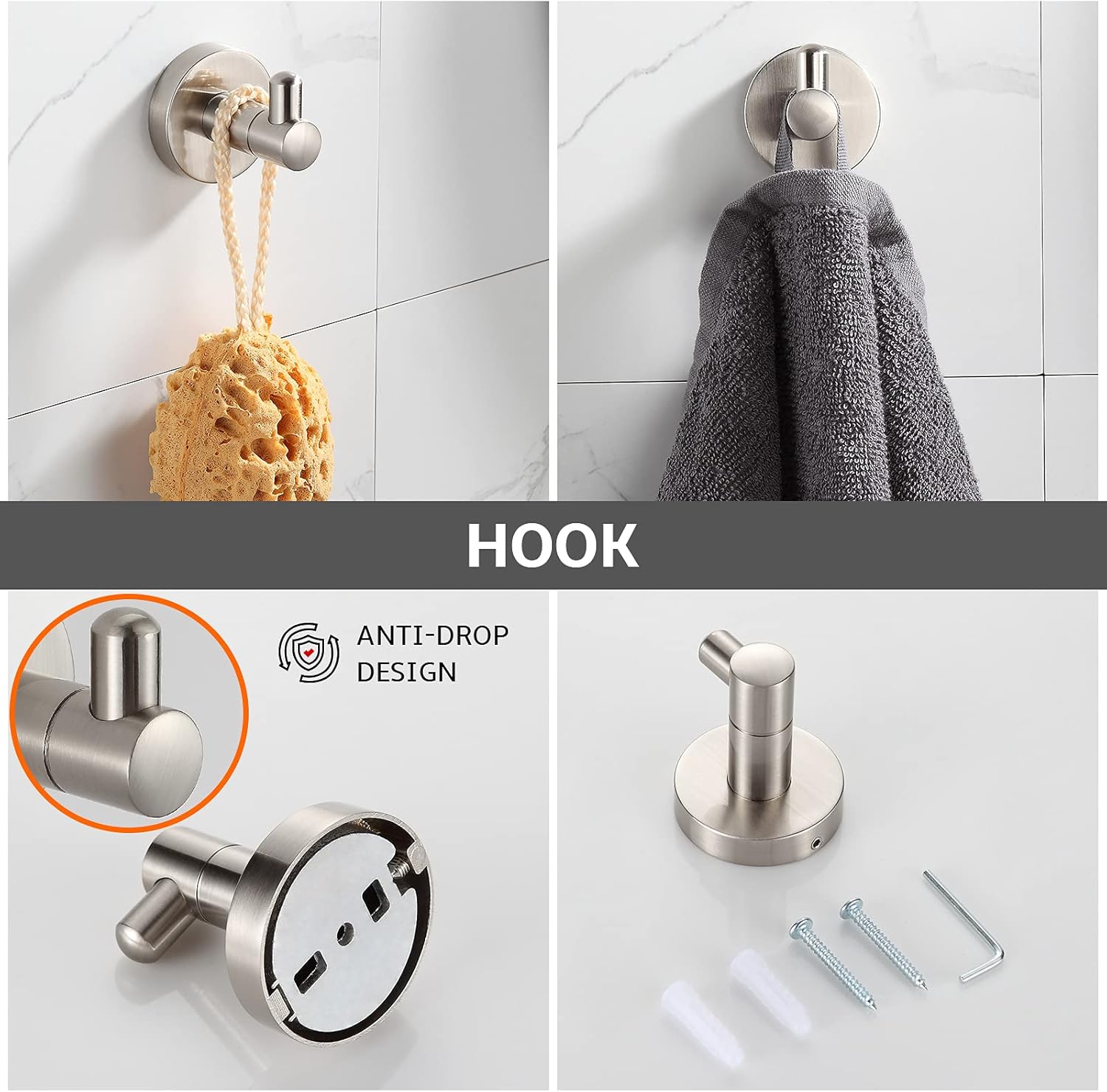 4 Piece Kit- 24 inches towel bar, towel ring,toilet roll paper holder, robe hooks. One complete towel hanger set meet all your need in daily life.