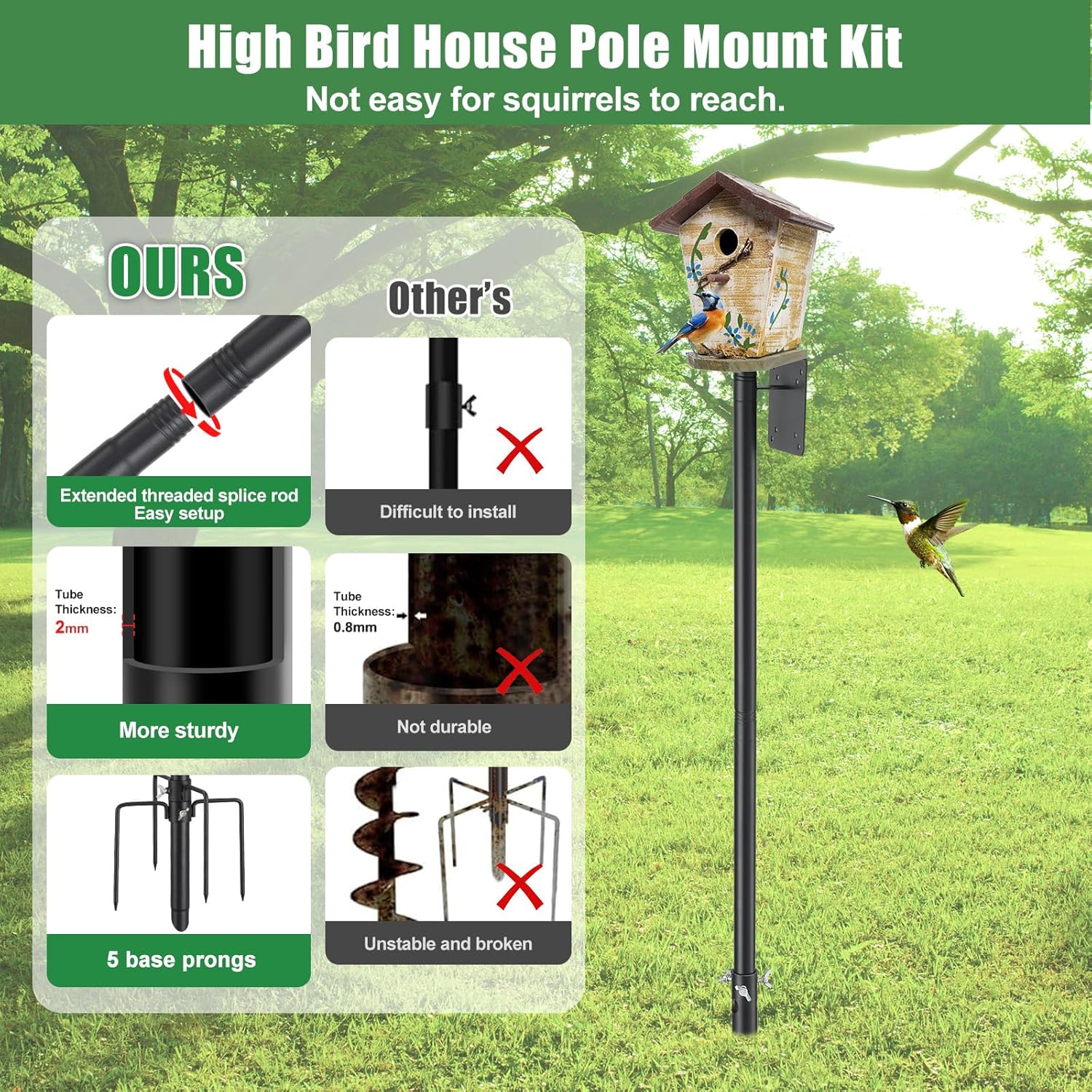 Stable 5-Prong Base – With a total height of 48 inches, including a 10-inch 5-prong base, this bird feeder pole provides excellent stability. The wide base ensures that the pole stays upright, even in windy conditions, giving you peace of mind.