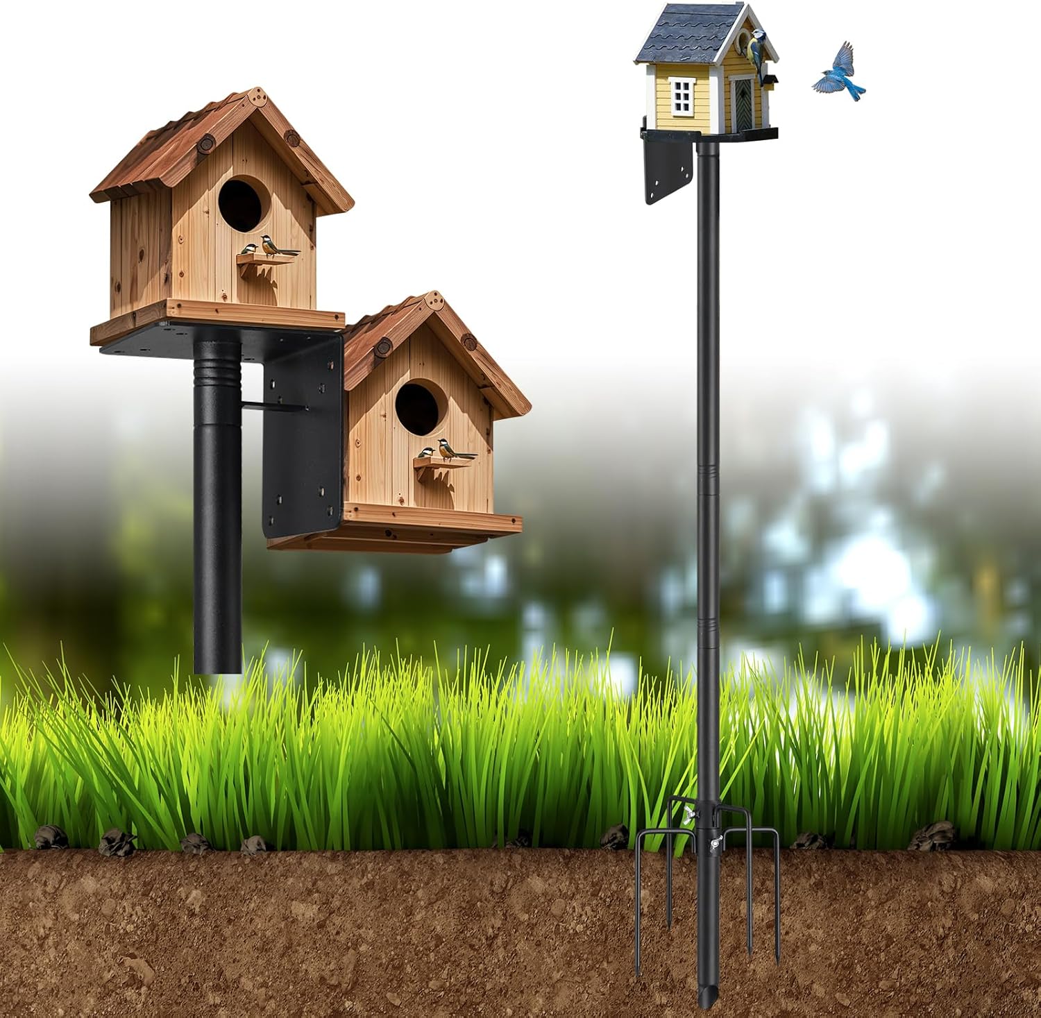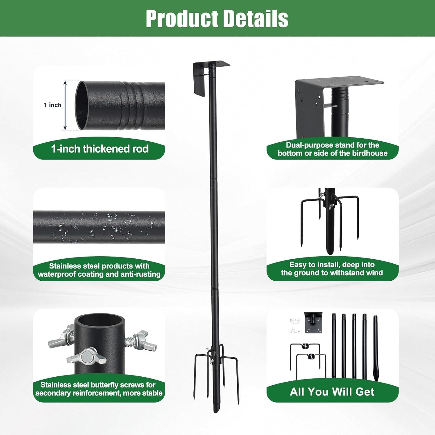 Premium Metal Construction – Crafted from high-quality metal, our bird feeder pole is significantly thicker and stronger than others on the market, ensuring long-lasting durability. Its rust-resistant coating allows it to withstand harsh weather conditions and storms, protecting wild birds all year round.