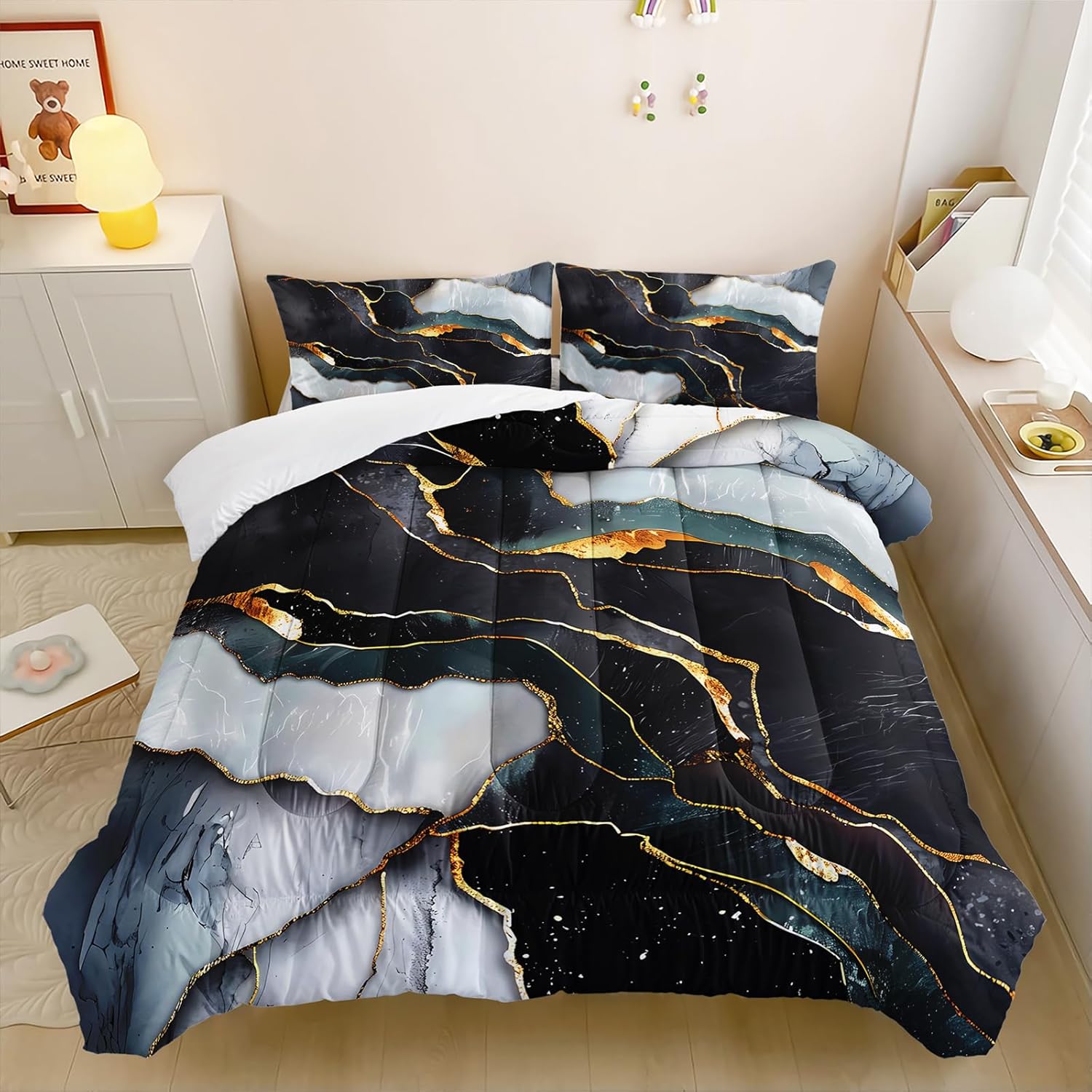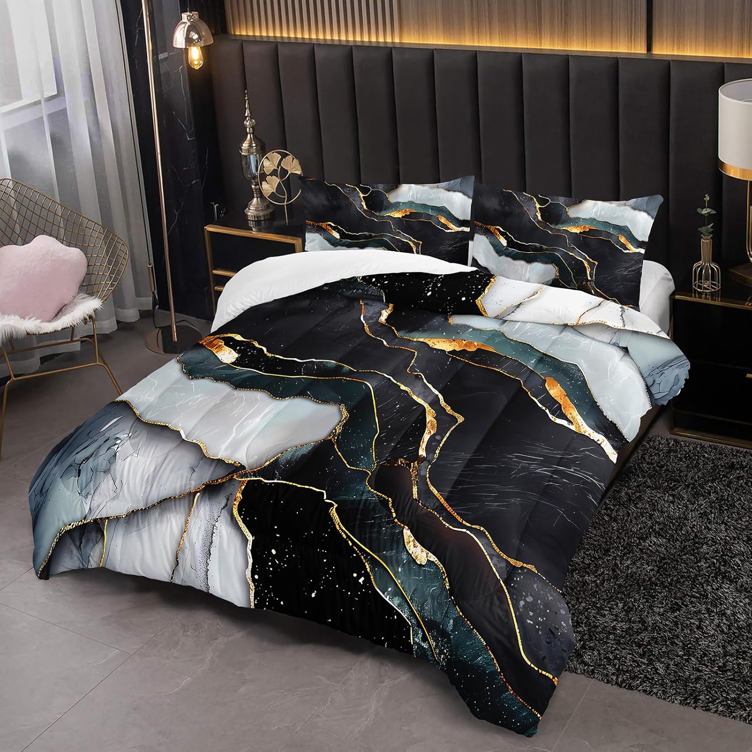 Black Marble Comforter Set for Men Adults, Gold Metallic Marble Design Bedding Queen Size, 3 Pieces with 1 Comforter and 2 Pillowcase All Season