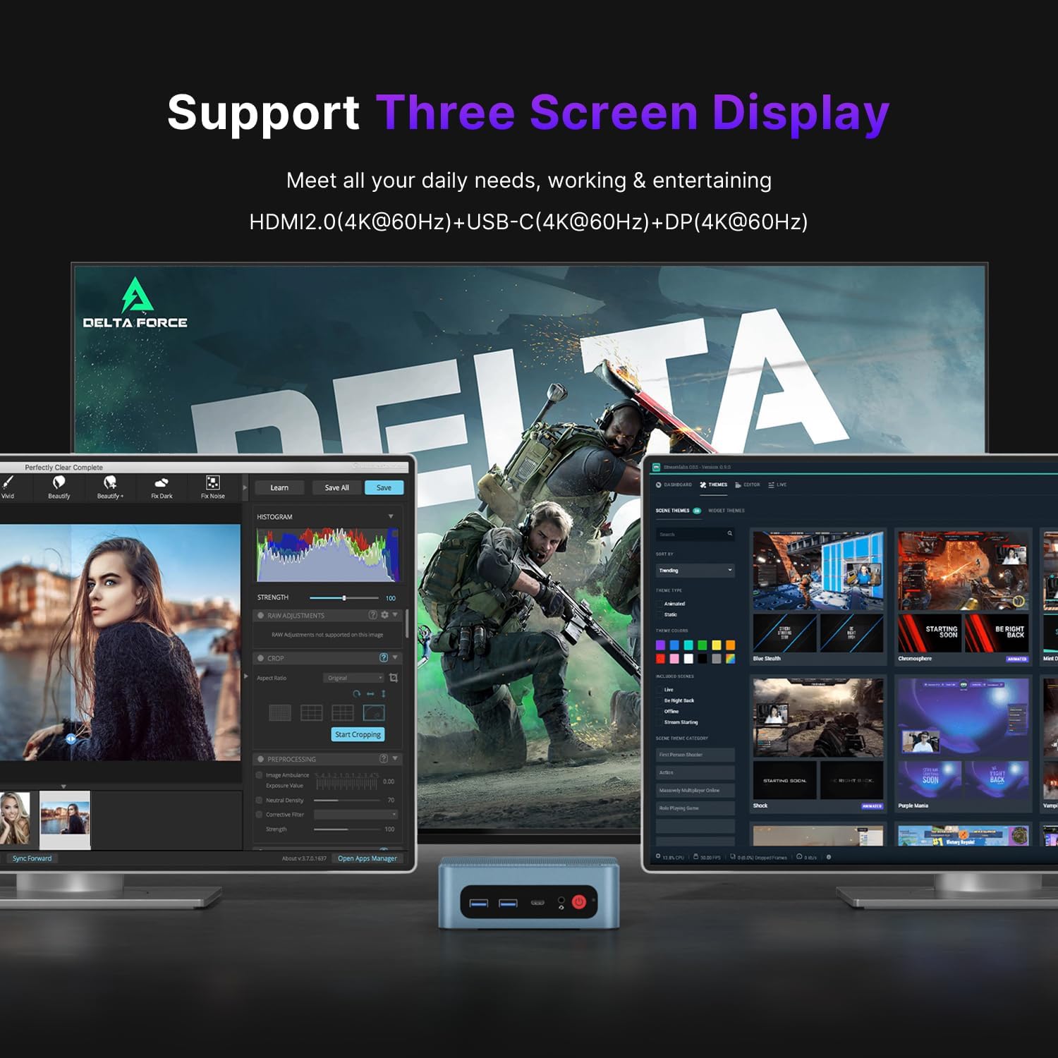 Support Triple 4K Display: Integrated Intel Iris Xe Graphics enable Bosgame micro pc P2 Neo to true to-life display quality bringing you a stunning visual experience. With its HDMI, DisplayPort, and Full Function USB-C ports, the P2 Neo Intel mini pc 12450H can support up to three displays for an extended workspace.