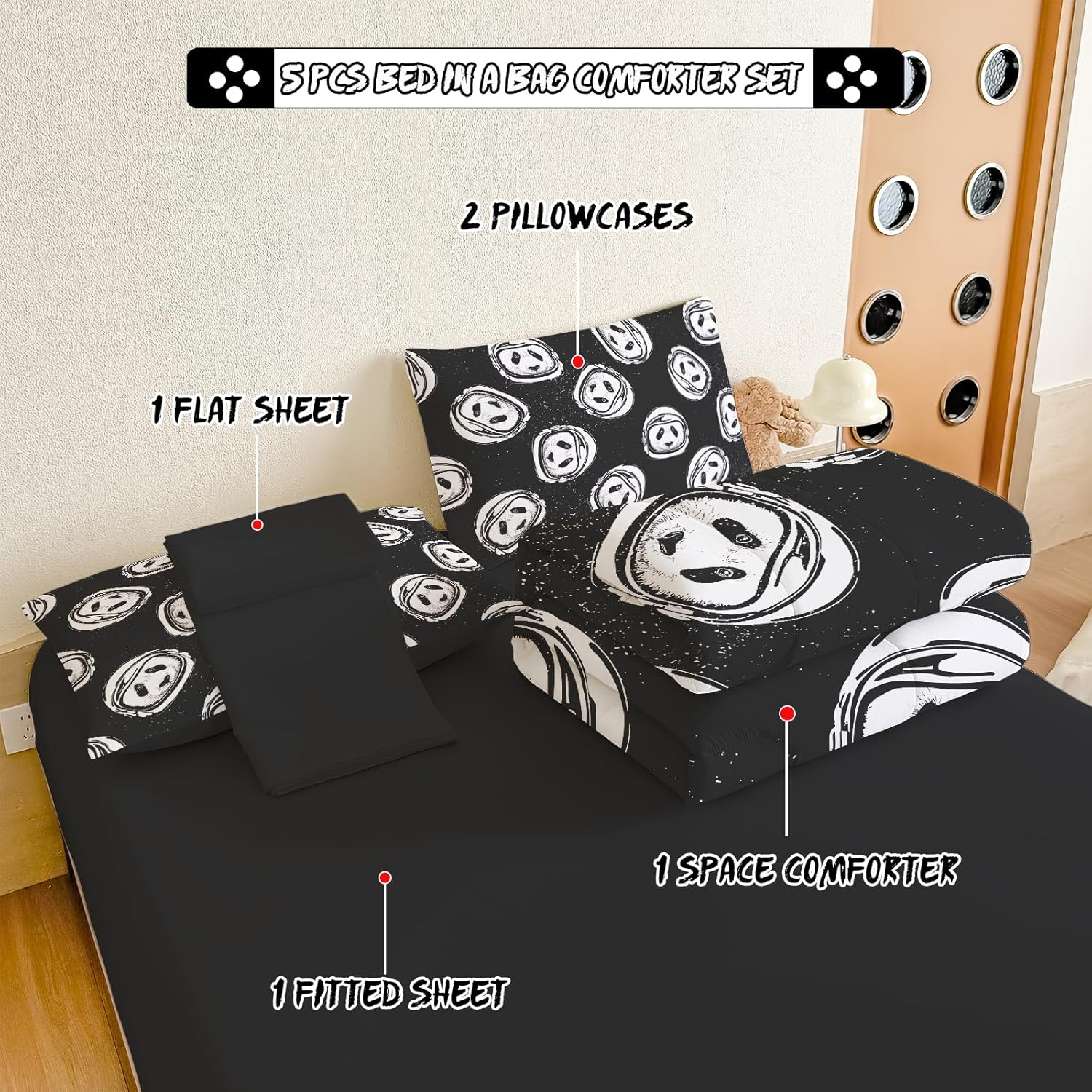 𝐄𝐱𝐩𝐥𝐨𝐫𝐞 𝐭𝐡𝐞 𝐆𝐚𝐥𝐚𝐱𝐲 𝐟𝐫𝐨𝐦 𝐭𝐡𝐞 𝐂𝐨𝐦𝐟𝐨𝐫𝐭 𝐨𝐟 𝐁𝐞𝐝: Transform bedtime into an exciting cosmic journey with this 5-piece space-themed full kids bedding set, designed to spark your child’s imagination and bring a sense of adventure into their bedroom. Featuring vibrant rockets, colorful planets, and dreamy starry skies, this boys comforter set full size is more than just cozy—it’s a story waiting to unfold each night. 𝐂𝐨𝐦𝐩𝐥𝐞𝐭𝐞 𝐒𝐞𝐭 𝐟𝐨𝐫 𝐄𝐟𝐟𝐨𝐫𝐭𝐥𝐞𝐬𝐬 𝐁𝐞𝐝𝐫𝐨𝐨𝐦 𝐌𝐚𝐤𝐞𝐨𝐯𝐞𝐫: With 5 coordinated pieces, you have everything you need: This full size bed sheets and comforter set contains a plush comforter, fitted and flat sheets, pillowcases, and even two matching cushion covers. It’s the perfect package to create a space-themed sanctuary for your little astronaut. 𝐆𝐨𝐨𝐝 𝐐𝐮𝐚𝐥𝐢𝐭𝐲 𝐌𝐚𝐭𝐞𝐫𝐢𝐚𝐥𝐬: Crafted from high-quality microfiber, this boys bed set is lightweight yet warm, ultra-soft to the touch, and gentle on children’s skin. The durable fabric resists fading, wrinkling, and pilling, while its vibrant prints remain bright even after many washes. 𝐏𝐫𝐚𝐜𝐭𝐢𝐜𝐚𝐥 & 𝐏𝐚𝐫𝐞𝐧𝐭-𝐀𝐩𝐩𝐫𝐨𝐯𝐞𝐝: Busy parents will love the low-maintenance care—just toss the full size comforter sets with sheets in the washing machine and tumble dry. The fitted sheet features deep pockets to ensure a snug fit on standard mattresses. 𝐏𝐞𝐫𝐟𝐞𝐜𝐭 𝐆𝐢𝐟𝐭 𝐈𝐝𝐞𝐚 Looking for the perfect gift? This all-in-one teen boy bedding is a thoughtful and fun present for birthdays, holidays, or back-to-school room makeovers. It’s sure to be a favorite for any child who dreams of rockets, planets, and stars