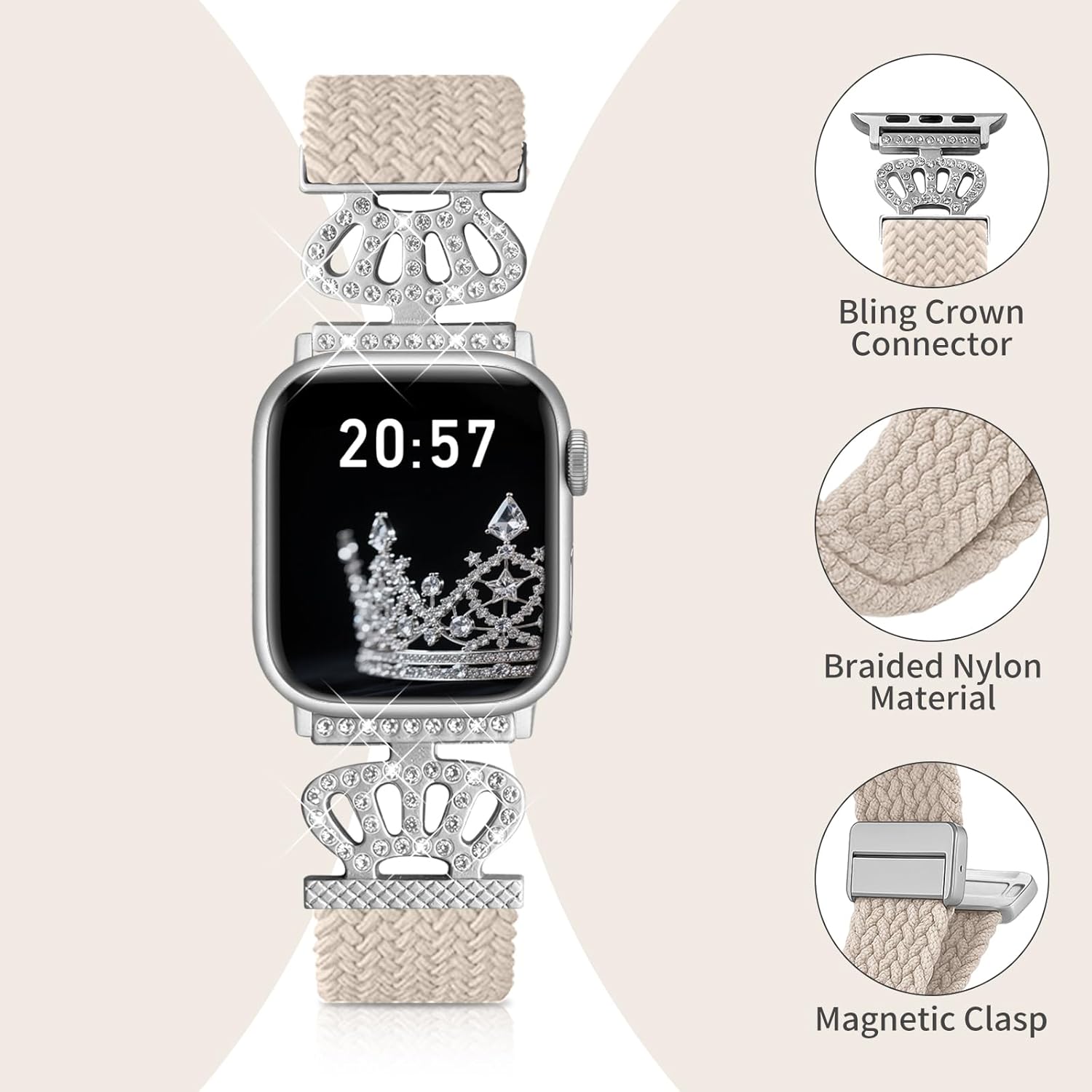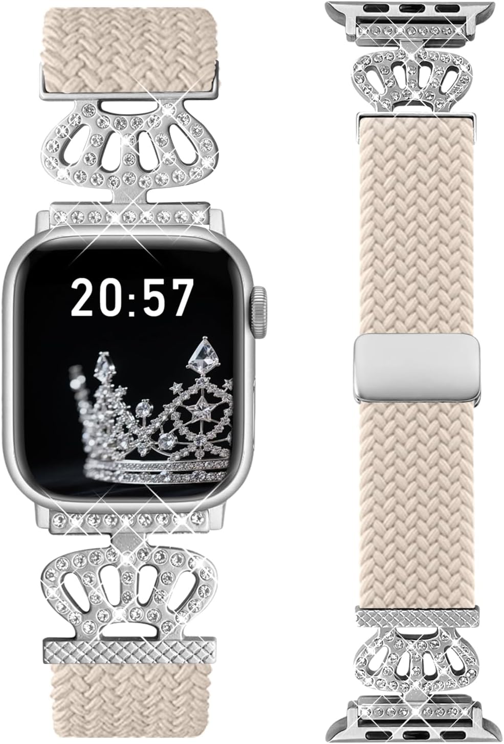 Braided Band Compatible with Apple Watch Bands 40mm 38mm 41mm 42mm 44mm 45mm 46mm 49mm,Magnetic Soft Nylon Stretchy Strap with Designer Bling Crown Strap for Series 10/9/8/7/6/5/4/3/2/SE/Ultra