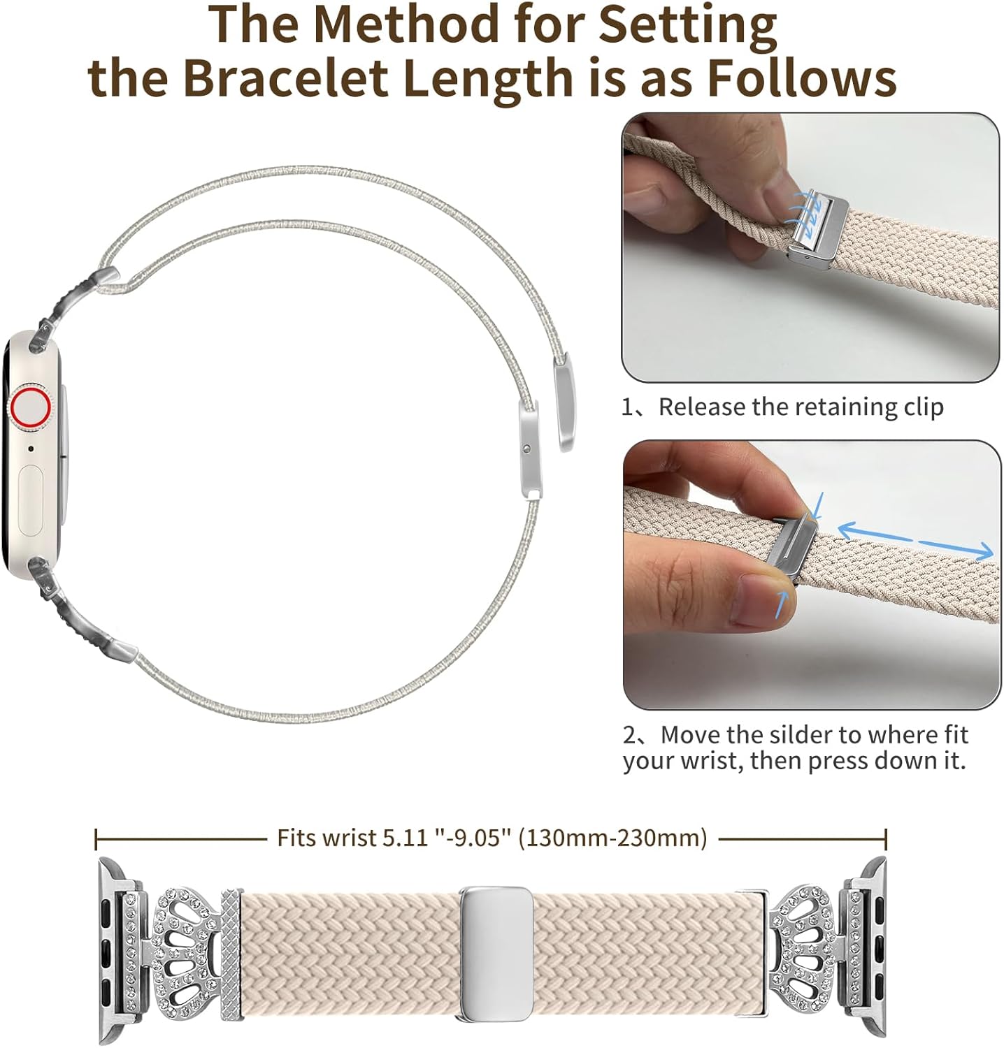 New Design: Enhance your style with this exquisite crown-inspired band, featuring secure sparkling diamond accents on the smartwatch connector. The elegant fusion of classic nylon weave and regal-inspired shimmer ensures your compatible Apple Watch makes a bold fashion statement—perfect for everyday elegance and special occasions alike.