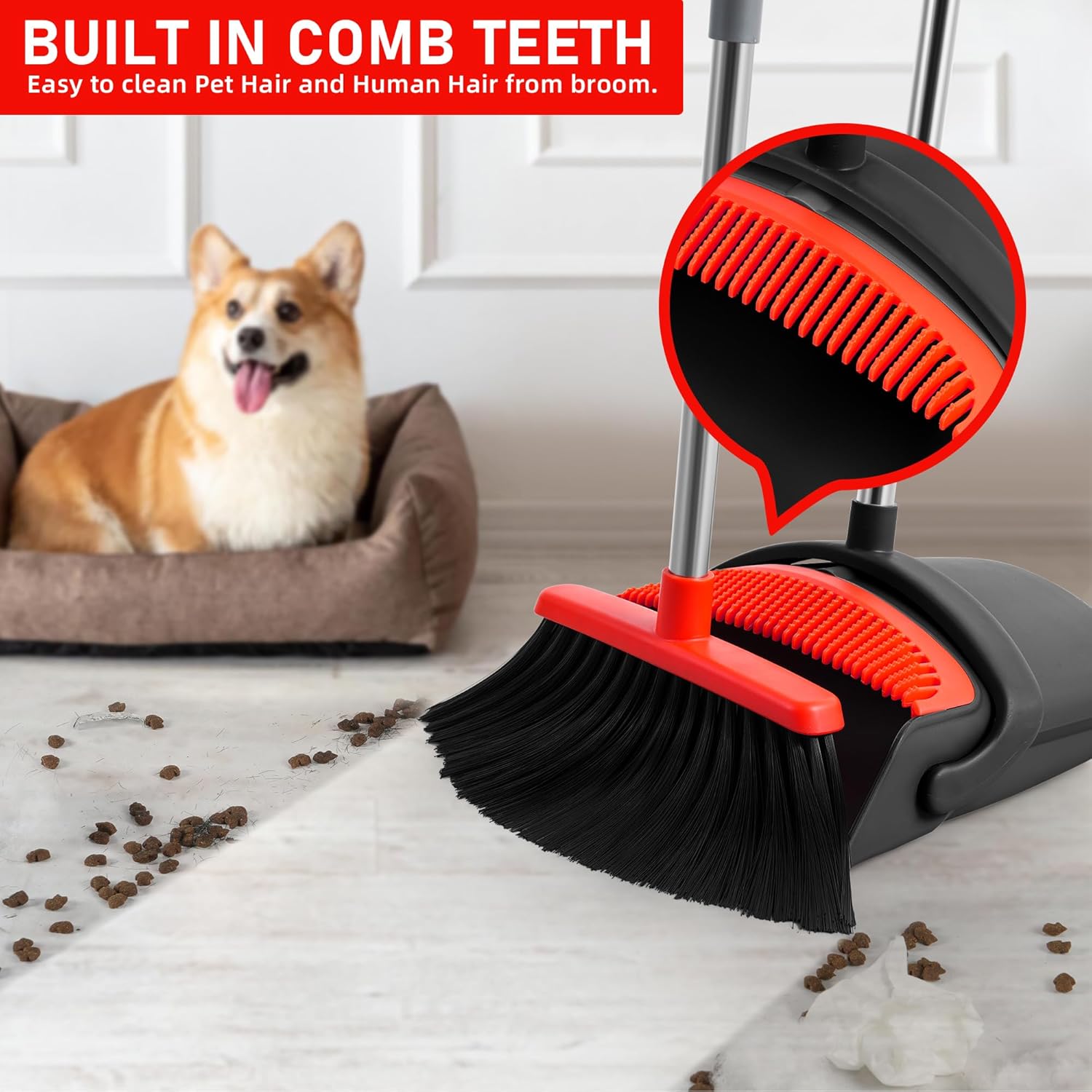 【DUSTPAN COMB TOOTH DESIGN】The broom with dustpan set has a comb tooth, which is convenient to scrape the hair and debris on the broom into the dustpan, no need to drag by hand, easy to clean people hair/pet hair and dust on the broom. The brooms and dustpans sets is a great choice for families with pets.