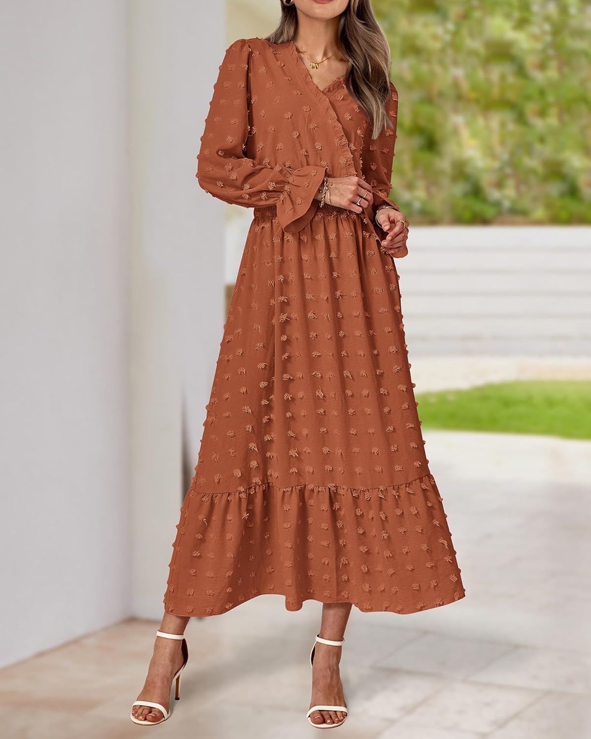 The Ruffle Long Sleeve Maxi Dress Is Made Of Lightweight And Comfy Chiffon Fabric.Trimmed With Classic V Neck, Ruffle Long Sleeves, Elastic High Waist, Cute Swiss Dots.V Neck, Ruffle Hem And Empire Waist Make The Long Dresses Suitable For Most Figures and Creates a Flowy And Flattering Silhouette.