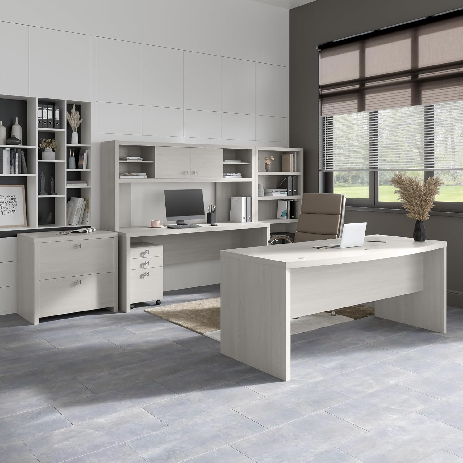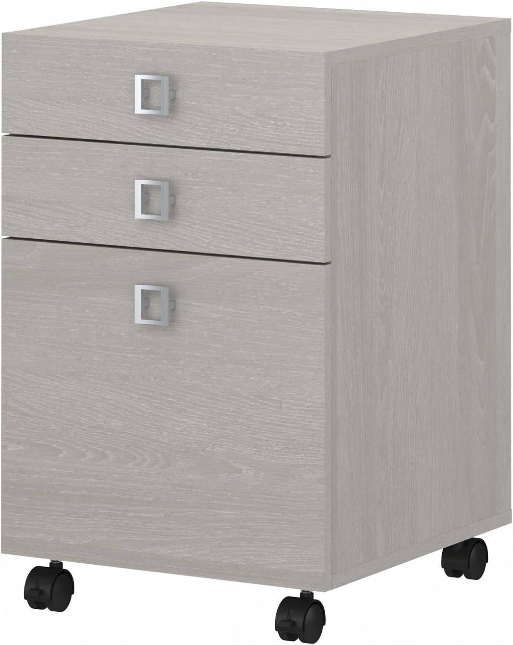 Blend style, flexibility and reliability at work or in your home. The Bush Business Furniture Echo 3 Drawer Mobile File Cabinet combines your choice of elegant Pure White or Gray Sand finishes with fashionable Satin Silver hardware to inspire your professional best. Give your workspace commercial-grade quality that promotes growth and productivity with convenient, reliable features. This contemporary filing cabinet provides two box drawers for office supplies and utensils as well as a full-extension file drawer that opens on smooth ball bearing slides for an easy reach to letter size documents. Four dual-wheeled hooded casters allow the Cabinet to roll wherever you need storage and can be locked in place for secure positioning. Slide the Mobile File Cabinet underneath your desk or move wherever you need supplies and paperwork. A durable, thermally fused laminate finish maintains the beautiful appearance for years. From Bush Business Furniture, the Mobile File Cabinet comes with a 3 Year Manufacturer’s Warranty and meets ANSI/BIFMA quality standards for safety and performance. Browse our full line of contemporary furniture to create an office set you’ll love for years to come. Celebrate your unique style and personality with the Echo Collection.