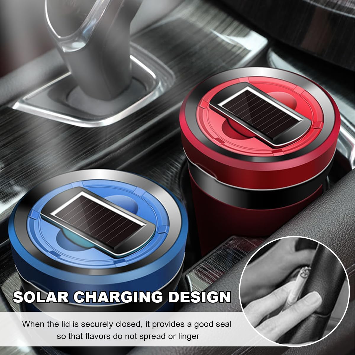 Unique Design: The ashtray is equipped with a blue LED light that provides soft illumination when the lid is opened, thus improving visibility at night. It also features a cigarette lighter and an intelligent extinguishing function, which is easy to use and can effectively prevent the risk of dry burning