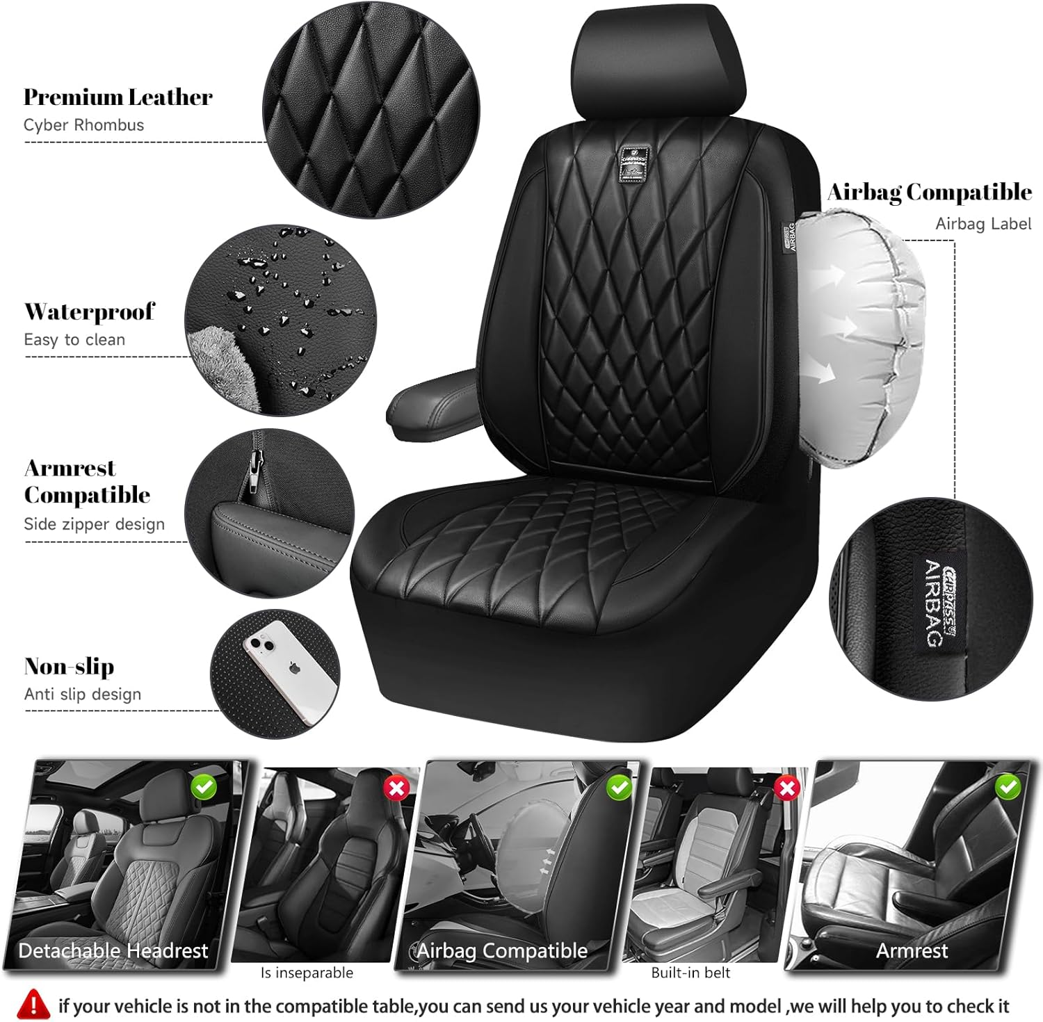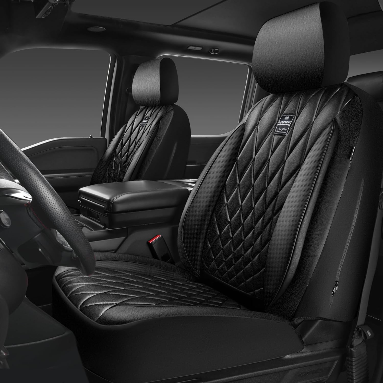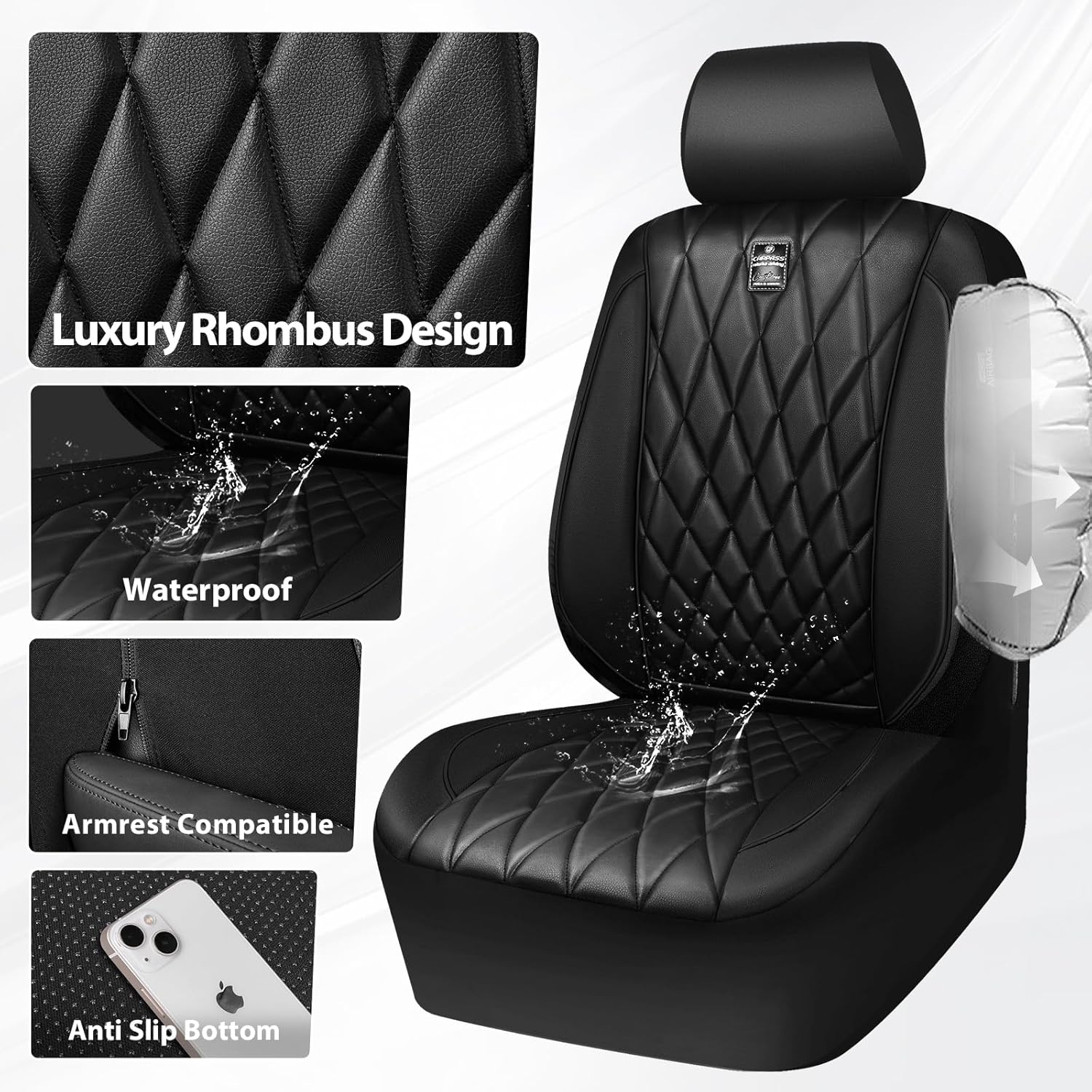 【PREMIUM LEATHER SEAT COVERS】Black car seat covers front seats are made of premium leatherette leather & a stylish diamond-shaped design, adding a touch of fashion and luxury to your car’s interior. At the same time, protect your seat from spills, stains, pet hair. They are scratch restant, waterproof, durable.