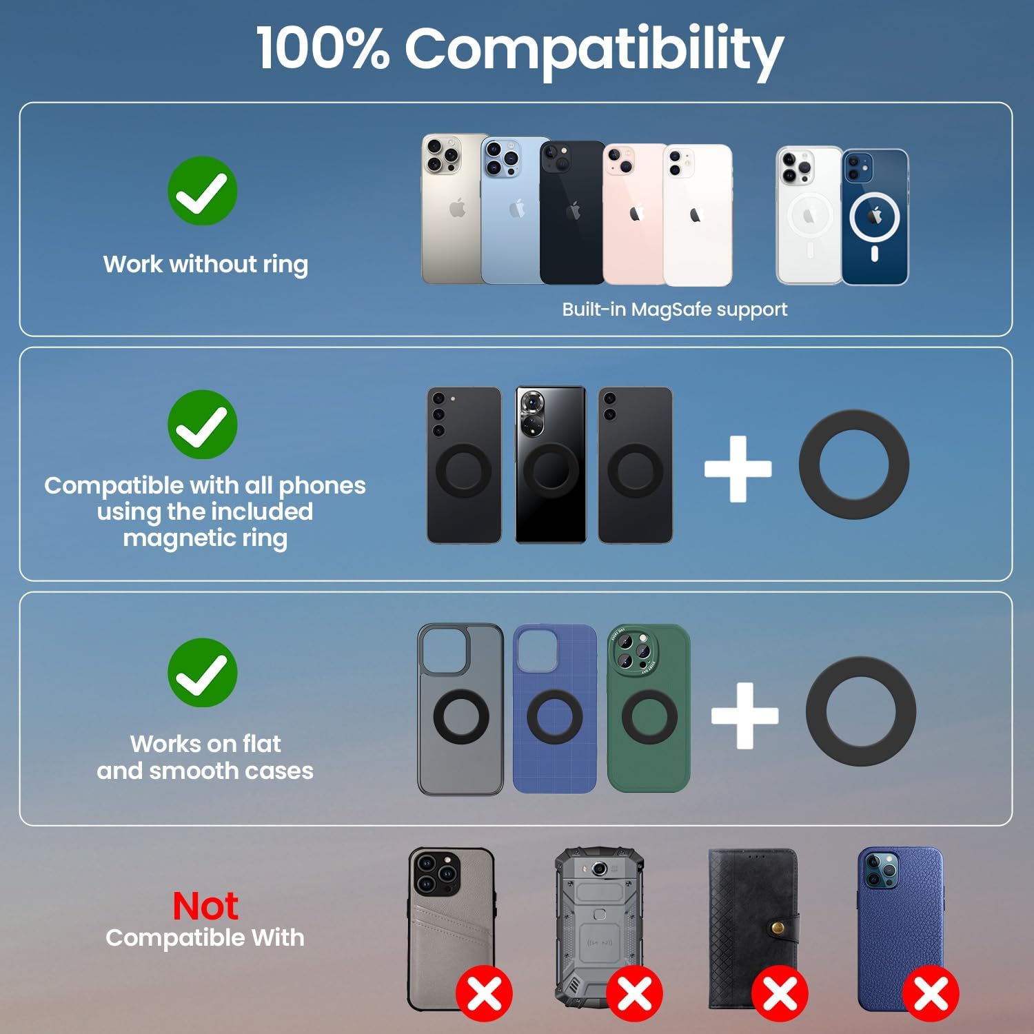 [Universally compatible with MagSafe] This car phone holder mount designed for iPhone 16/15/14/13/12 series and all MagSafe-compatible devices, this mount includes 2 magnetic rings to ensure a strong magnetic hold for non-MagSafe phones as well. Its exceptional compatibility works with various car models, ensuring a secure and easy fit in any vehicle.