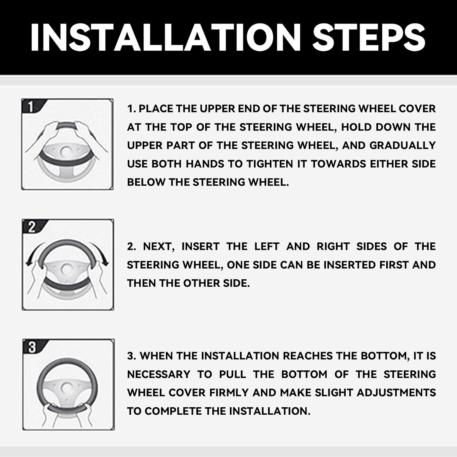 【Without Inner Ring】: No inner ring design, very flexible installation. Steering wheel covers without inner rings do not experience problems such as inner rings hardening or breaking. No tools are required, just place the steering wheel cover over the steering wheel, grab the sides of the wheel with both hands, pull directly towards the bottom of the steering wheel until it is fully fitted, and then rotate the steering wheel cover to adjust it to the best position.