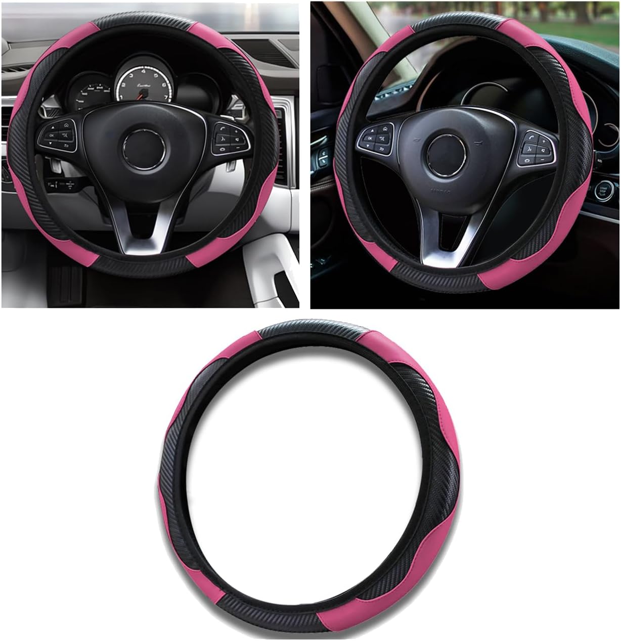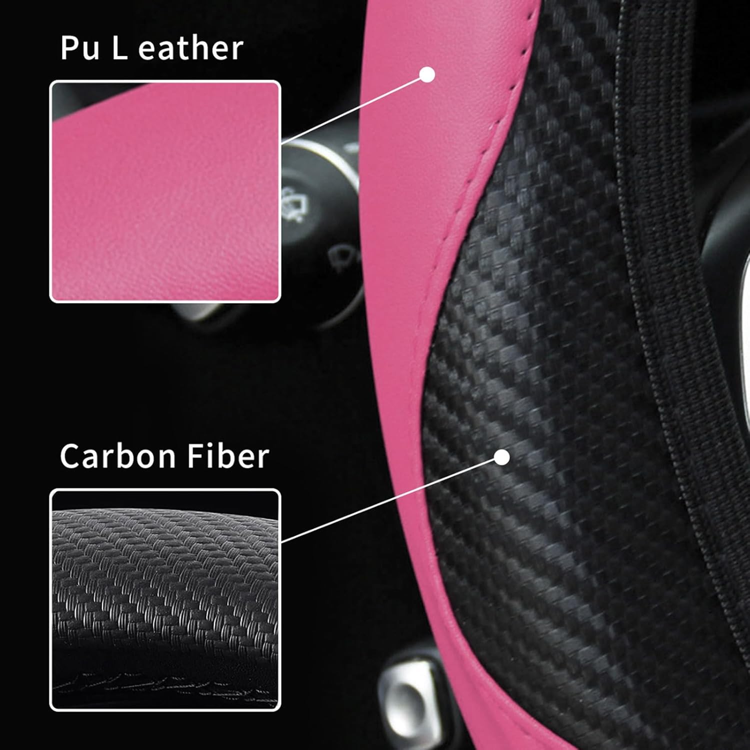 Car Steering Wheel Cover, 15 inch Carbon Fiber Microfiber PU Leather Elastic Steering Wheel Protector for Unisex, Anti-Slip Breathable Car Interior Accessories for Most Cars (Pink)
