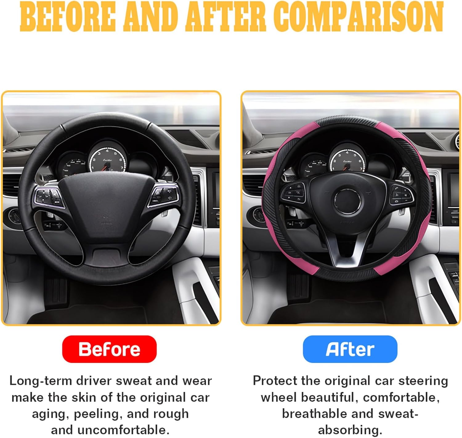 Universal Fit: Universal sizes are available for medium-sized steering wheels with a diameter of 14.5 inches to 15 inches (37 cm to 38 cm). It not only decorates your car perfectly, but also protects your steering wheel from sunburn, scratches, fading, wear and dirt, leaving the steering wheel in a brand new condition.