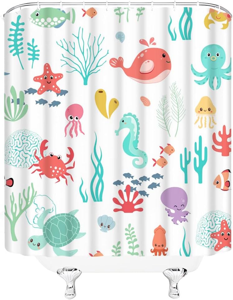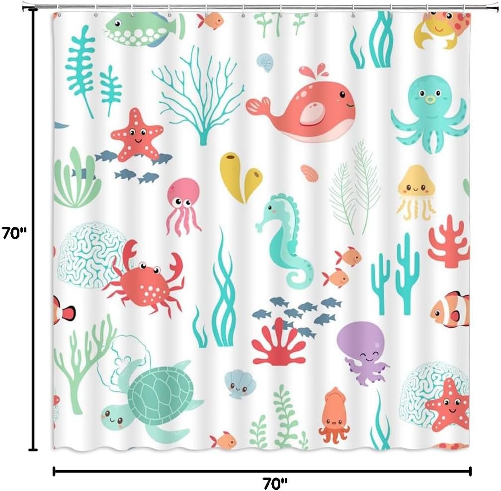 Cartoon Sea Animal Shower Curtain Nautical Ocean Underwater Coastal Beach Sea Marine Animal Dolphin Octopus Seaweed Boys Girls White Polyester Fabric Bathroom Curtain Sets Hooks 70 x 70 Inch