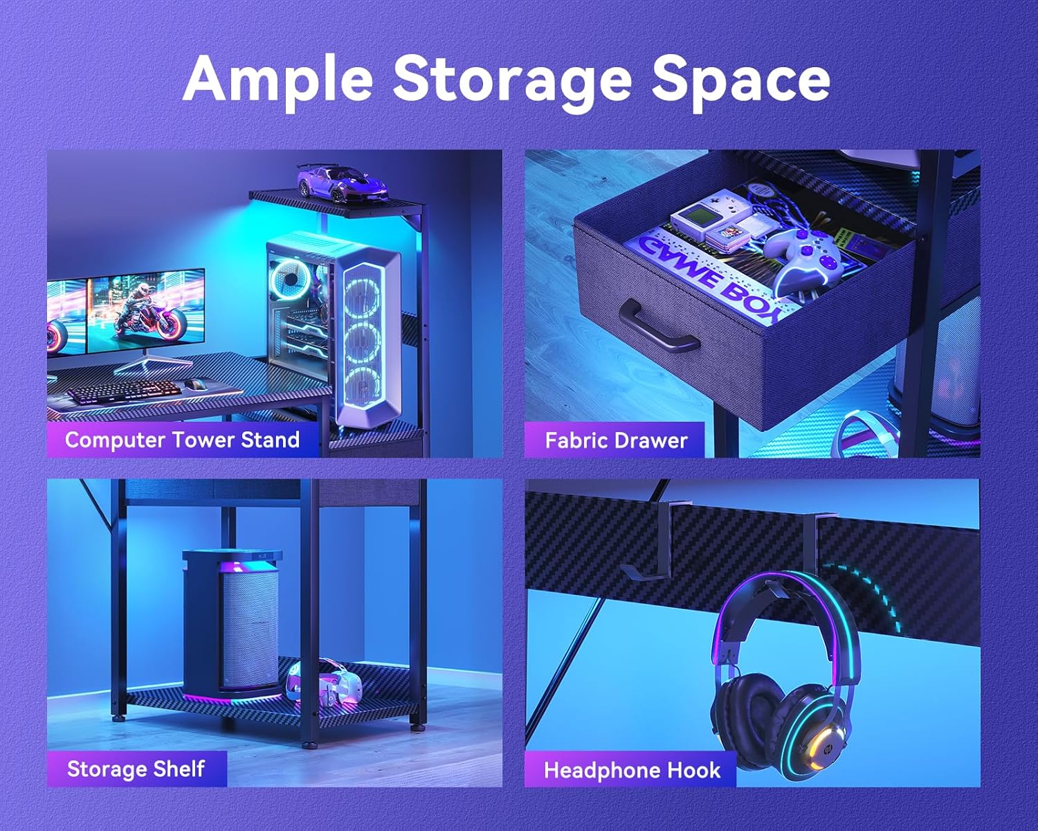Casaottima 48 Inch Gaming Desk with Storage & LED Lights, Reversible Computer Desk with Display Shelves & Fabric Drawer, Modern Gamer Desk Table with Side Headphone Hook, Carbon Fiber Black