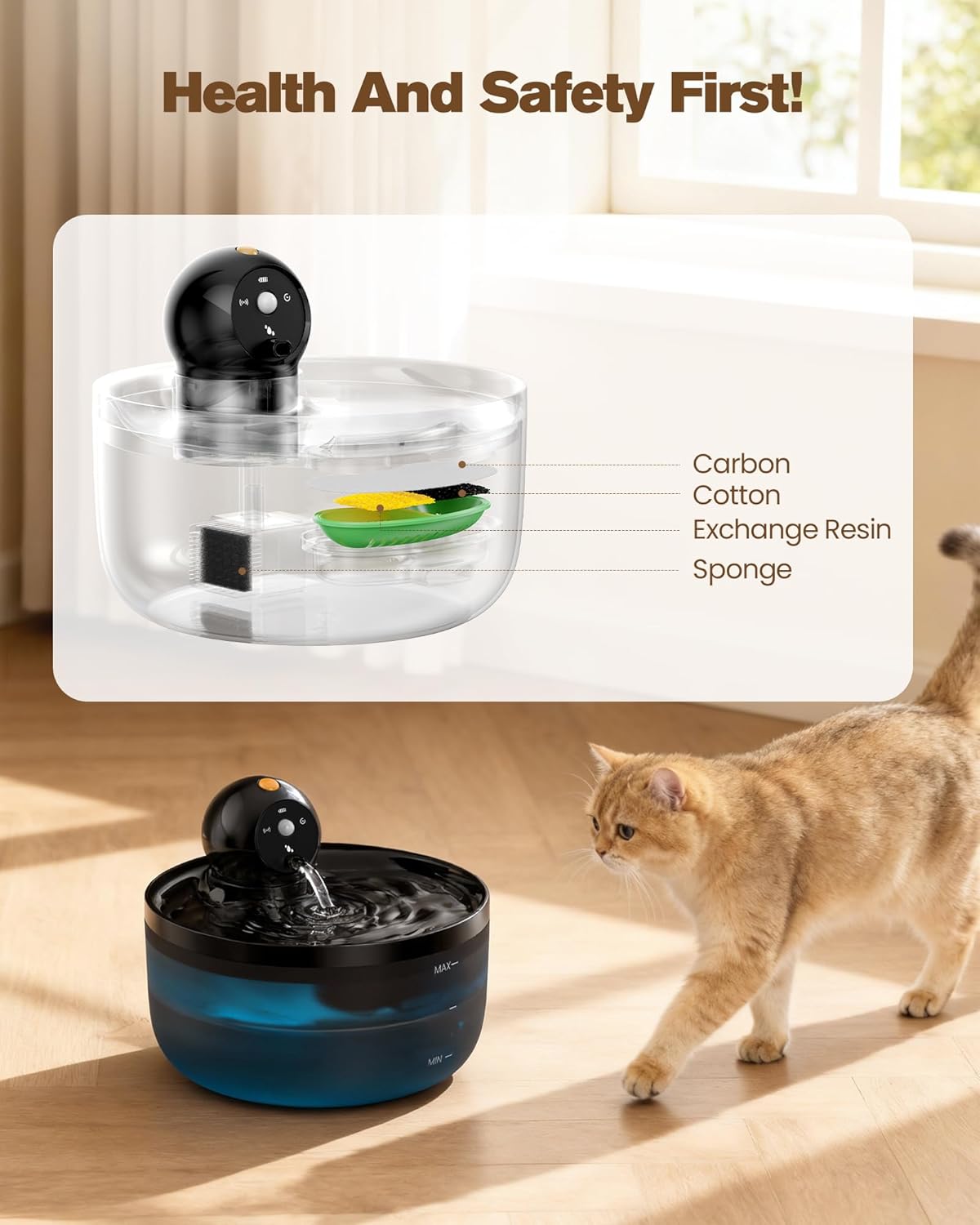 【A Week of Leisure】The 88oz/2.6L capacity Water fountains for cats indoor cordless means fewer water refills, you just need to fill it up on Monday and keep your hands leisure until the weekend. The upgraded filter element increases the filtration effect by 30%, efficiently filters impurities, hair, and odors, and cares for the safety of every sip of water for cats. (We recommend replacing the filter every two weeks)