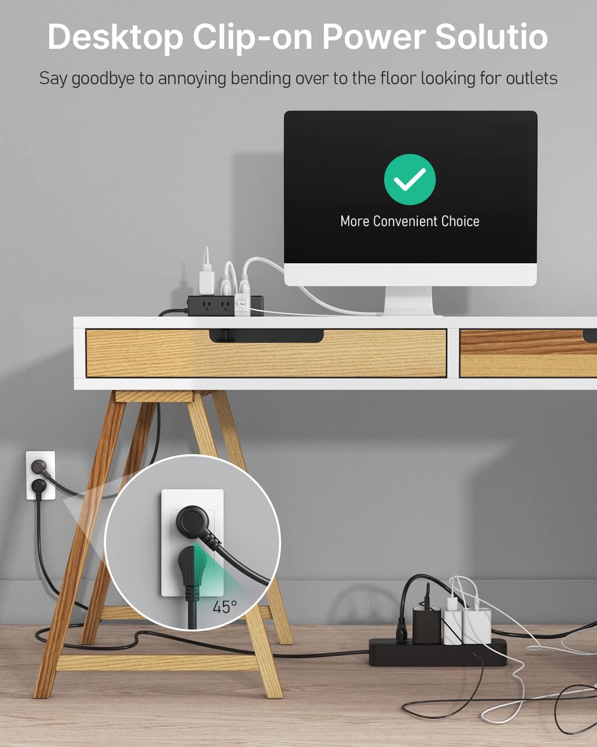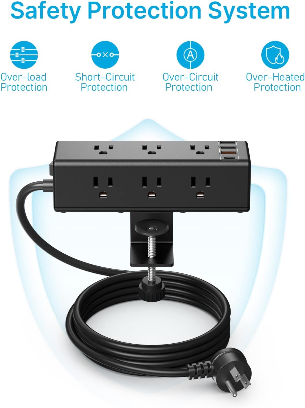 Come with Off/On switch and reserved a widely spaced outlet to plug desk electronic accessories large plugs. Don’t need to punch holes in the table. 1200J desk mount surge protector to absorb excess current to protect sensitive devices. Offer different cable lengths for different needs.