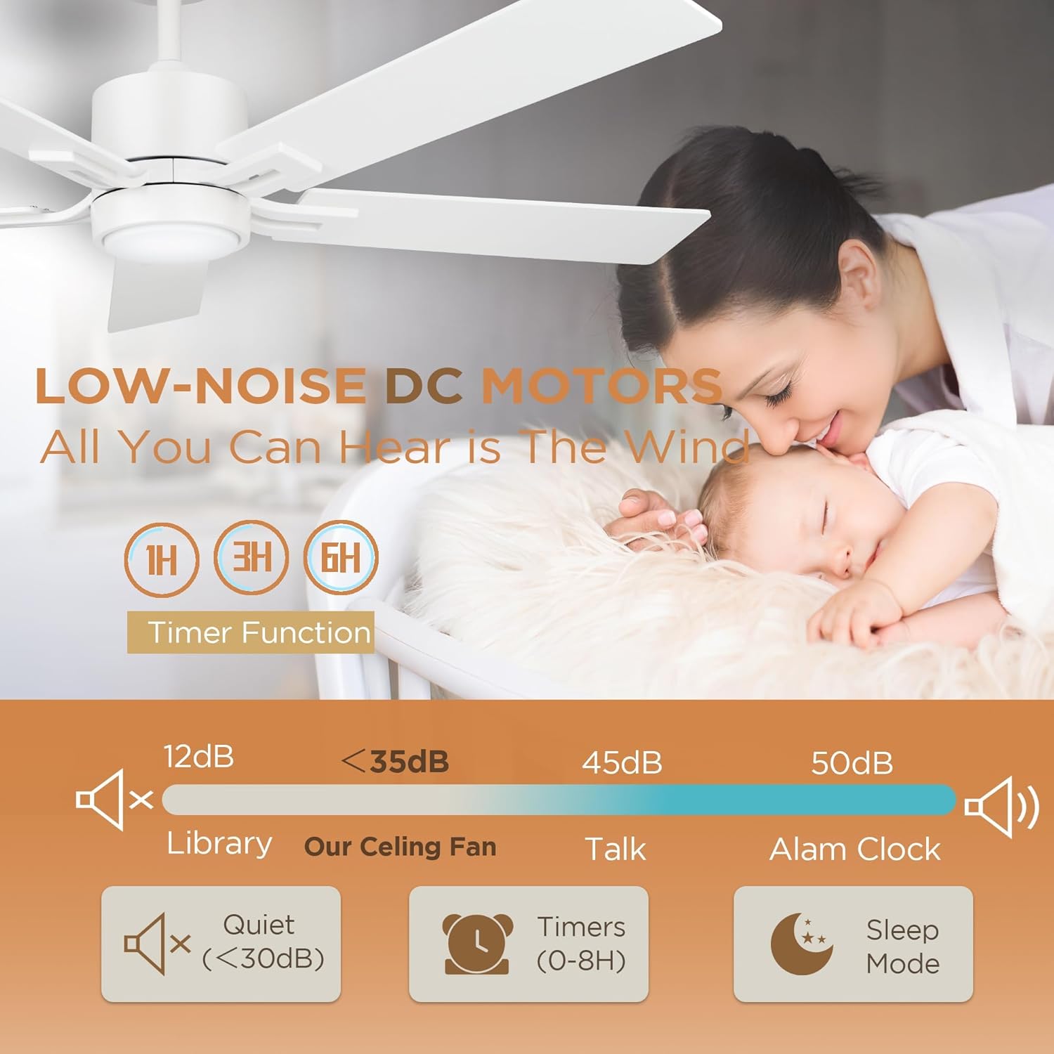 Silent Reversible Ceiling Fan: In the summer, the forward mode allows air to flow downward while the ceiling fan has a good airflow of over 5500 high CFM to keep you cool and less than 30 decibels of sound for a comfortable sleeping environment. In the winter, the reverse mode allows air to flow upward so that the warm air produced by the room’s heating equipment is evenly distributed throughout the room. You can keep the ceiling fan working, enjoying coolness and warmth all year round.