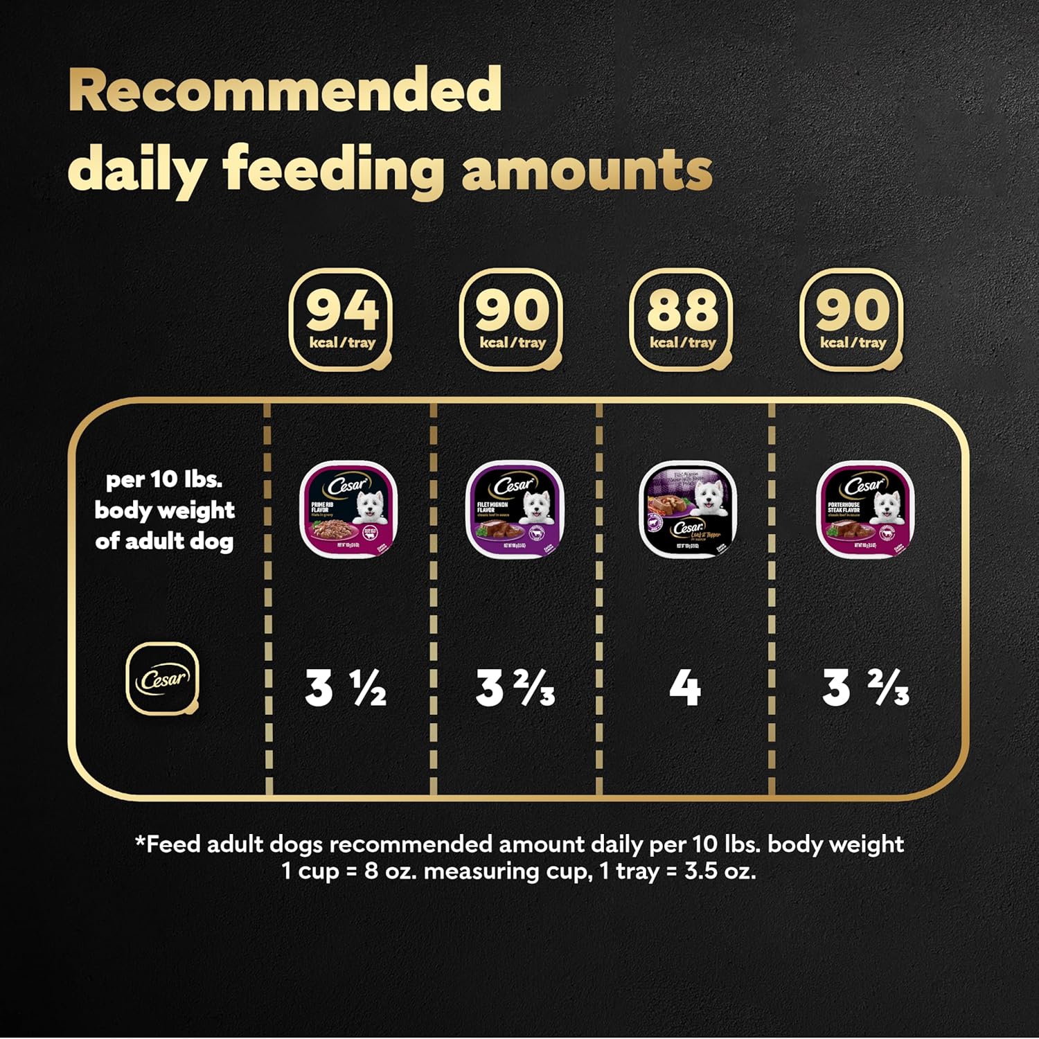 The Cesar brand shows that the best way to share love is by keeping pets happy and healthy with gourmet meals. With real beef as the #1 ingredient, Cesar Steak Lovers delivers high-quality protein and is slow-cooked for great taste. This dog wet food is easy to digest, yet hard to resist. Made in the USA with the finest ingredients from around the world, the soft dog food provides a 100% complete and balanced meal for adult dogs. There are no fillers, added sugar, or artificial flavors; ingredients remain natural as defined by the Association of American Feed Control Officials (AAFCO). These convenient trays also function as dog food toppers for dry food or can stand alone for a delicious culinary experience, supporting daily feeding routines for pet owners interested in dog nutrition. Each easy peel-away seal offers a gourmet soft texture that complements any dry kibble and can act as single-serve wet dog food that provides convenience. Enjoy delicious and healthy meals every day with Cesar.