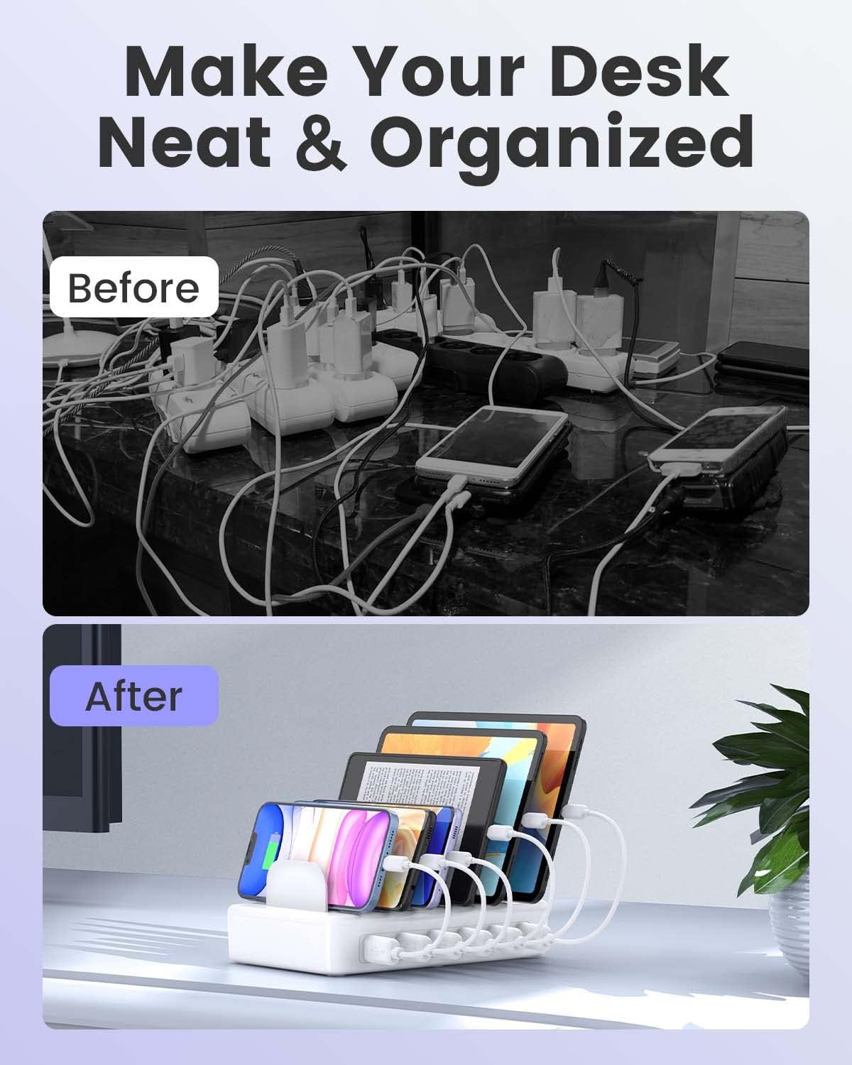 【Space Saver Gadget】 Effortlessly charge your iPhone with our all-inclusive phone charging station featuring 6 short cables, a 4.92-foot-long power cord, and a Type-A to Type-C adapter converter for ultimate convenience and versatility. CREATIVE DESIGN charging station keeps your devices nicely organized in a row, and there are no more adapters and tangled cords everywhere
