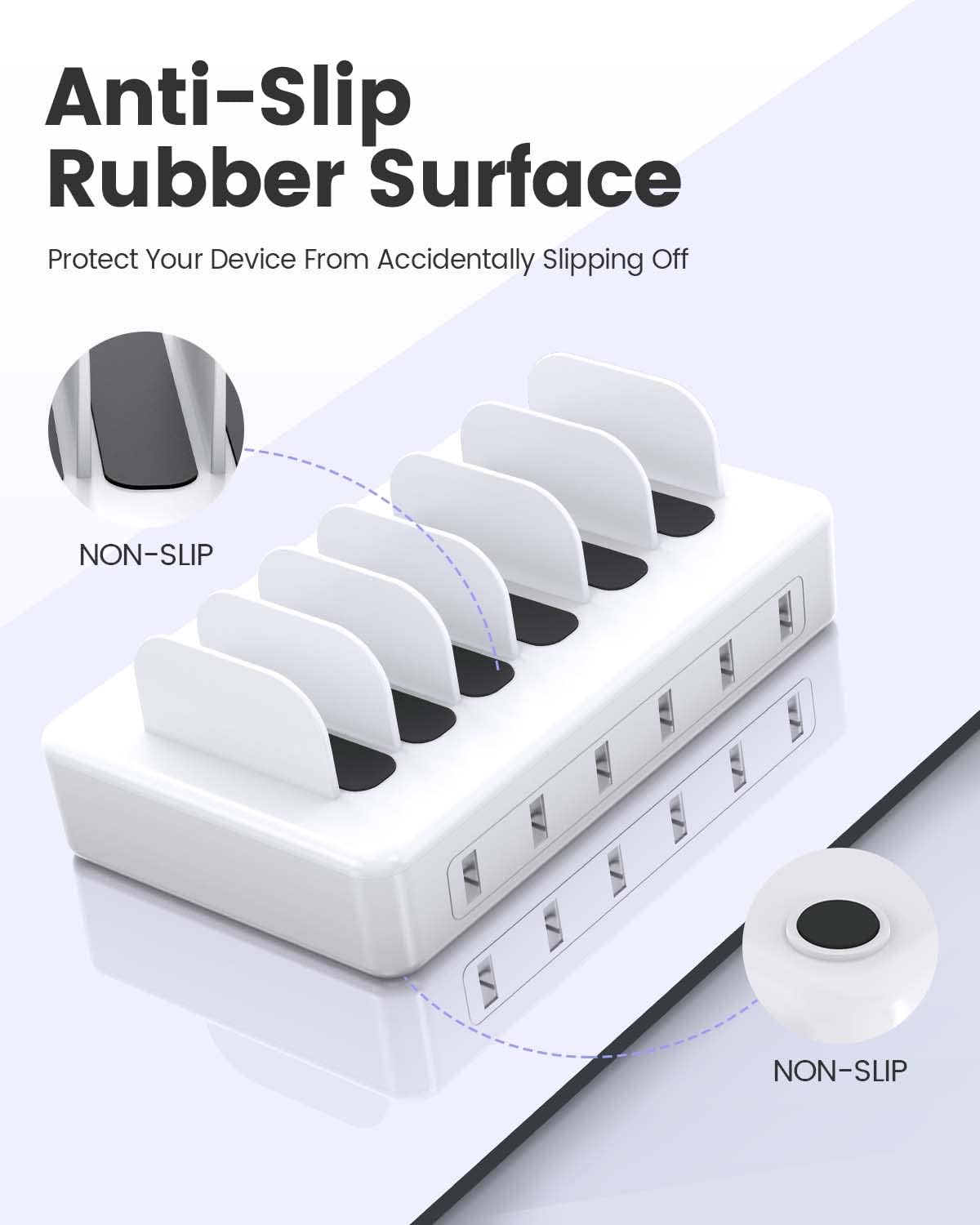 【6 IN 1 Charger Station】The charging station for multiple devices comes with 6 USB ports that hold various devices all in one place, keeping your phones, watches, earbuds, power banks, tablets, and other devices charged quickly and efficiently at one time. Our multi charger station is faster than regular chargers. It can charge your devices up to 80% faster because it provides more power – up to 2.4A compared to the 1A provided by regular chargers