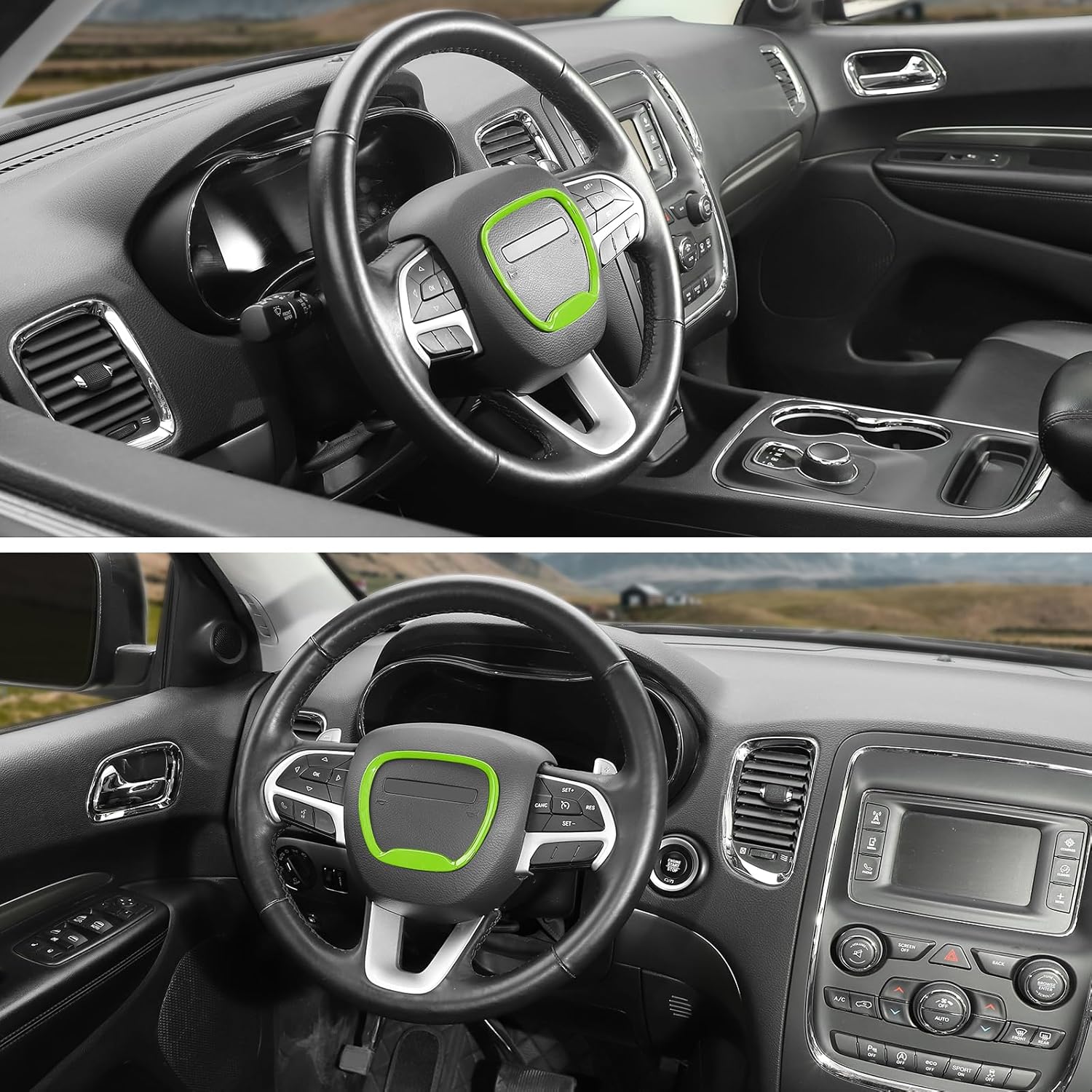 Perfect Fit 🚗: ,Light green central control steering button frame trim exclusively for Dodge Challenger, Durango, Charger 2015 2016 2017 2018 2019 2020 2021 2022 2023 2024 2025+ snugs the central control steering button frame flawlessly.
