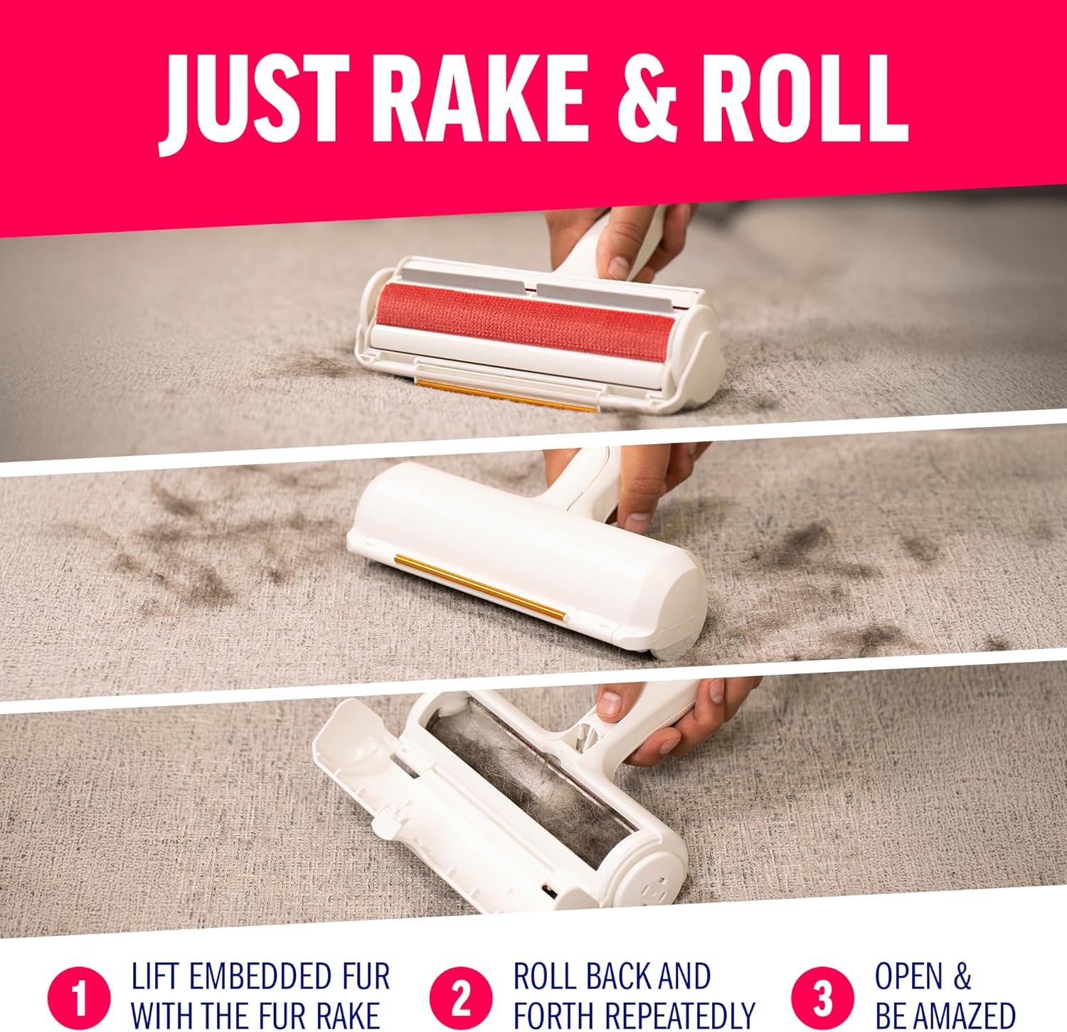 2-IN-1 PET HAIR REMOVAL POWER: Unlike traditional pet hair rollers, this upgraded design rakes embedded fur upward from carpets and hard-to-vacuum surfaces, then rolls back and forth to lift and collect hair—delivering a deeper, faster clean in one tool.