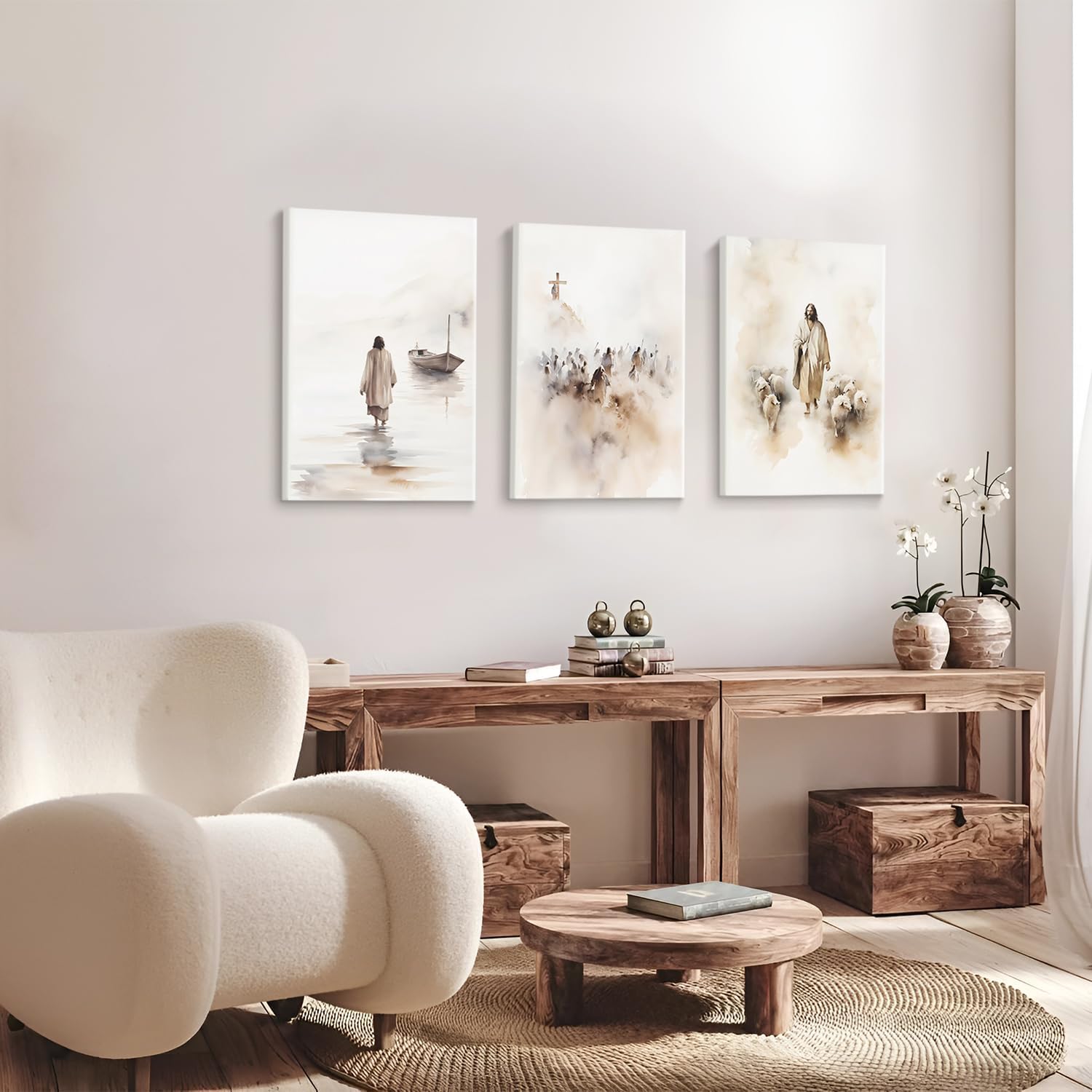 Christian Wall Art – Jesus Decor: 3 Pcs Jesus Wall Art, Christ Religion Canvas Wall Decor, Boho Art Home Pictures Posters Prints Paintings for Living Room, Bedroom, Church Decorations (12x16in Framed)