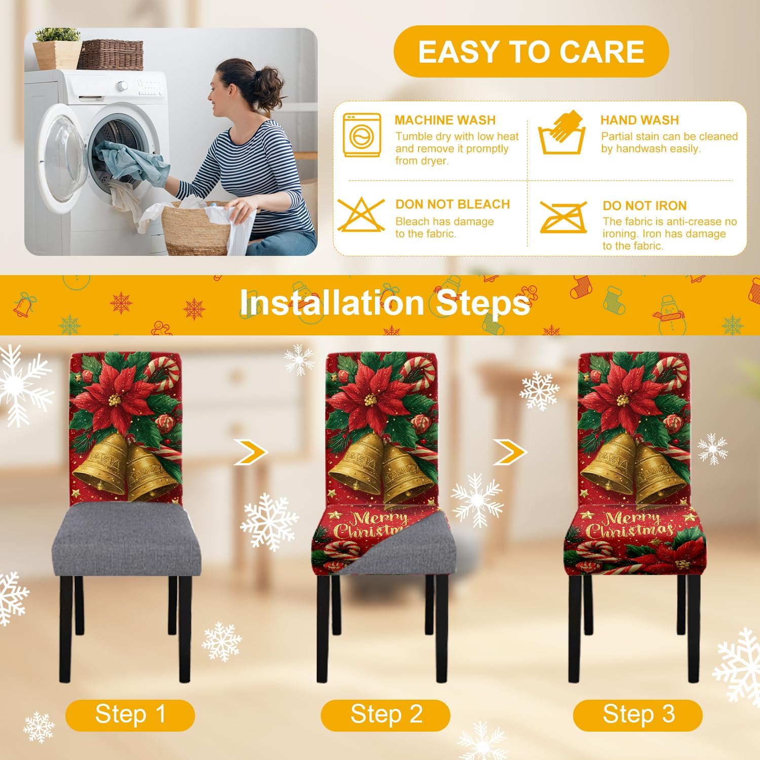 Easy Care: The dining chair covers are machine washable with cold water, Do not bleach or iron, and Tumble dry low; If Our chair covers have any quality problems, please get in touch with us, and We will provide you with the perfect after-sales service