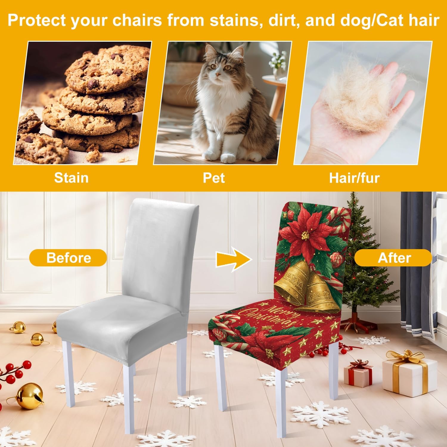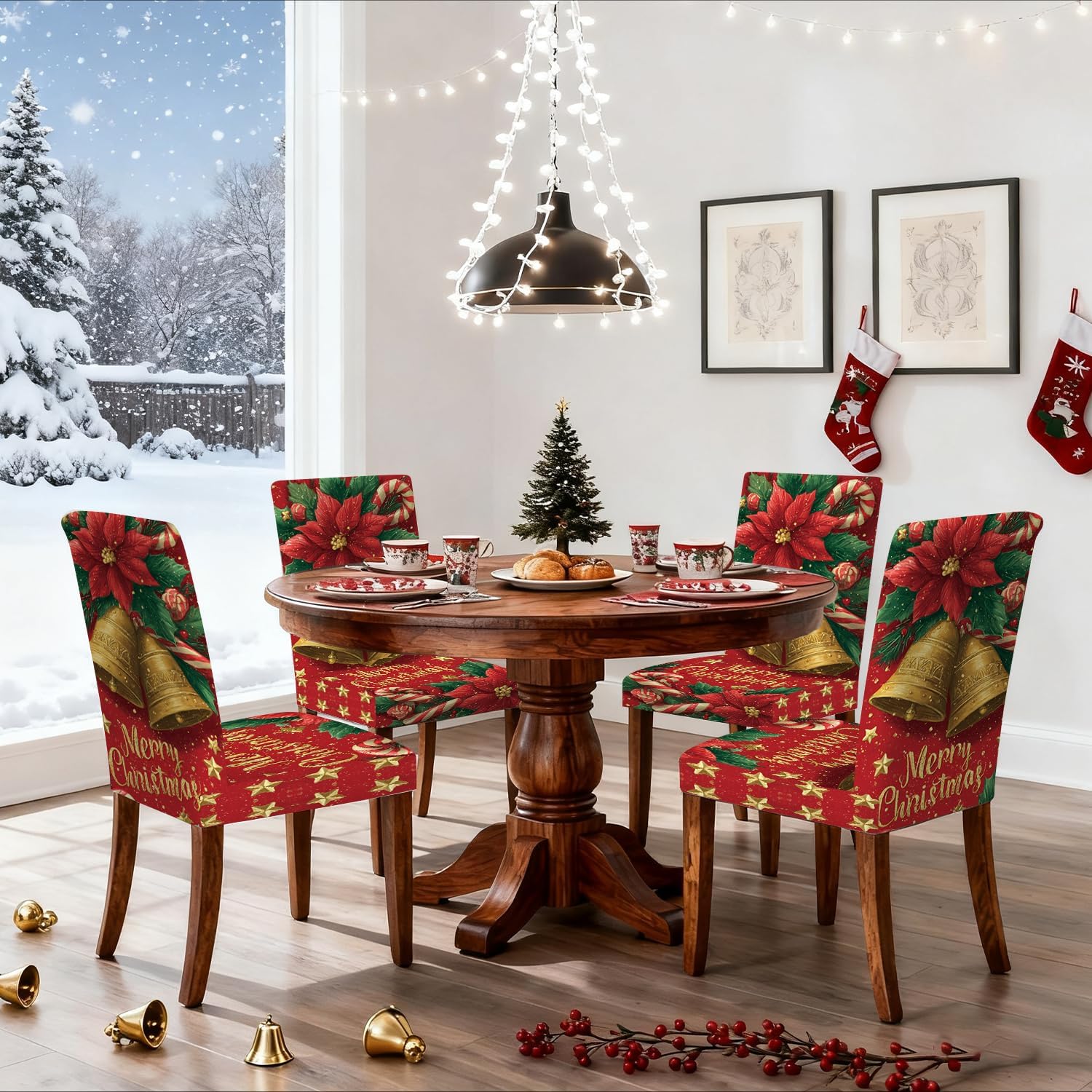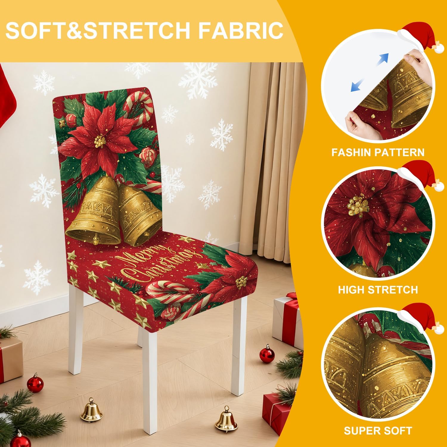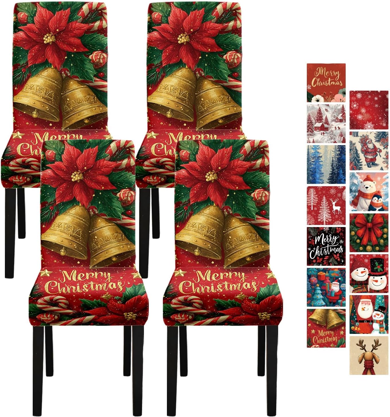 Decorate your dining room with festive elegance using this set of 4 Christmas bell chair covers. Featuring golden Christmas bells, vibrant poinsettia flowers, candy canes, and a “Merry Christmas” greeting on a rich red background, these slipcovers instantly add a cheerful holiday atmosphere. Made from high-quality stretch fabric, they fit most dining chairs snugly, offering a secure and wrinkle-free look. Perfect for Christmas dinners, family gatherings, and festive parties, these covers protect your chairs while enhancing your seasonal décor.