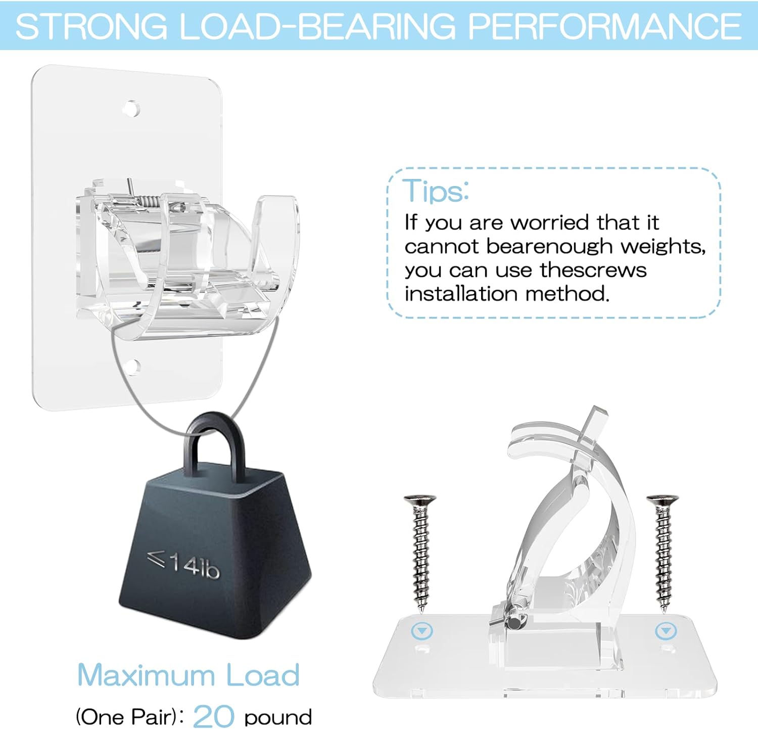 Size: 3.15 x 1.89 x 2.36 inchColor: TransparentInstall Methods: Self-Adhesive / Drill with screwsMax weighing: max bearing weight 14 lbs. If used together with screws, a pair of curtain rod brackets (2 pcs) can hold up to 20 lbs.