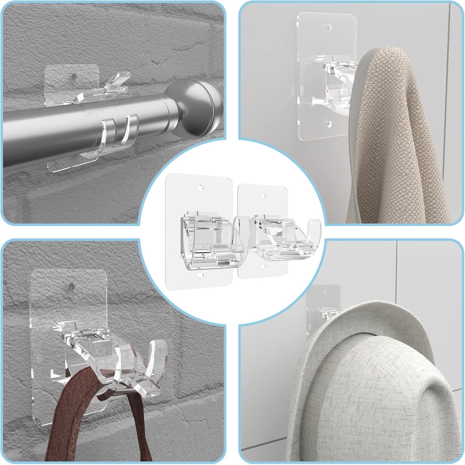 CIEMGNZOC 4PCS No Drill Curtain Brackets, Self-Adhesive Rod Holders, Adjustable Hooks for Rods Under 1.57 Inch (Transparent)