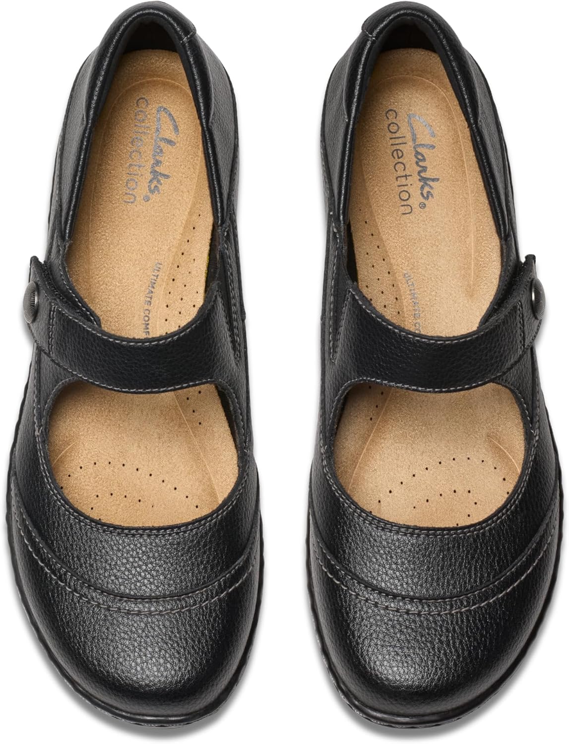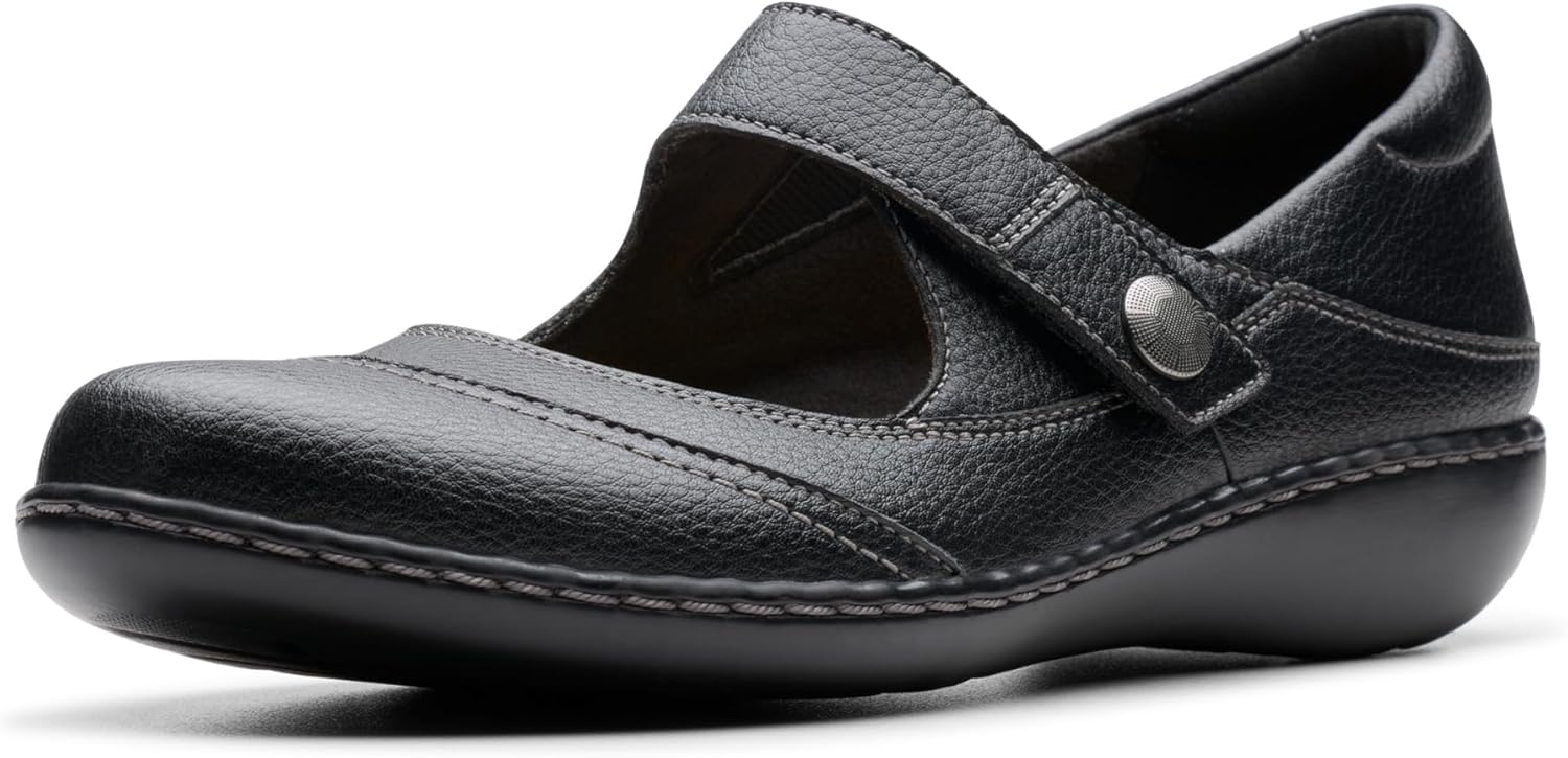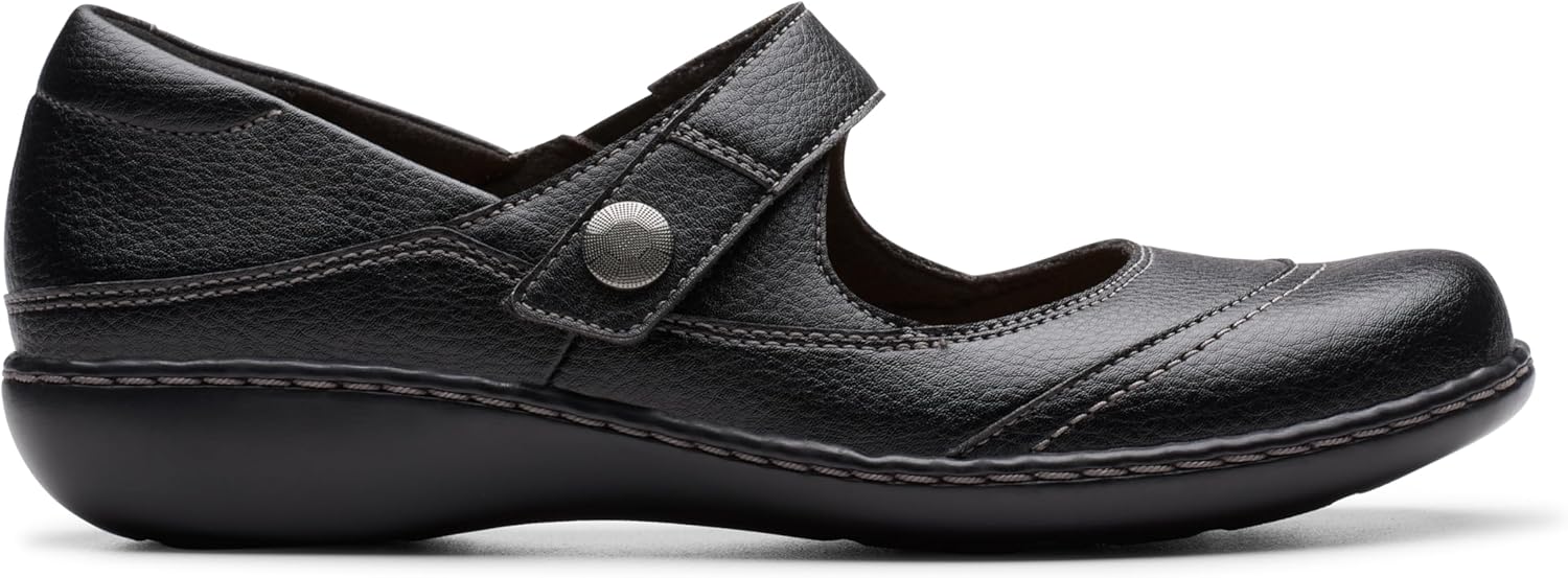 Easy-wear casual shoe Clarks Collection Ashland Elayne arrives in tumbled black leather for a soft, durable feel. Big on comfort, it features a stretch fore, fabric linings and a super flexible lightweight sole. – Durable black tumbled leather upper – Mary Jane strap with adjustable fastening – Soft textile lining – Grippy TR (thermoplastic rubber) outsole – Heel height: 35mm